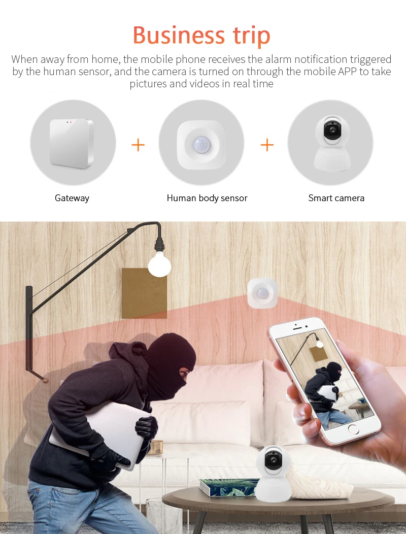 Когда вы находитесь вдали от дома, мобильный телефон получает сигнал тревоги, срабатывающий с помощью датчика человека, и камера включается через мобильное приложение, чтобы снимать фотографии и видео в режиме реального времени