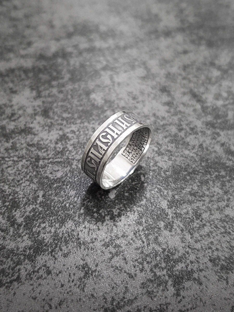 Кольцо изготовлено из 925 пробы серебра. Покрытие-Потемнение. Ширина стержня 7 мм. Внутри находится «Молитва водителя».