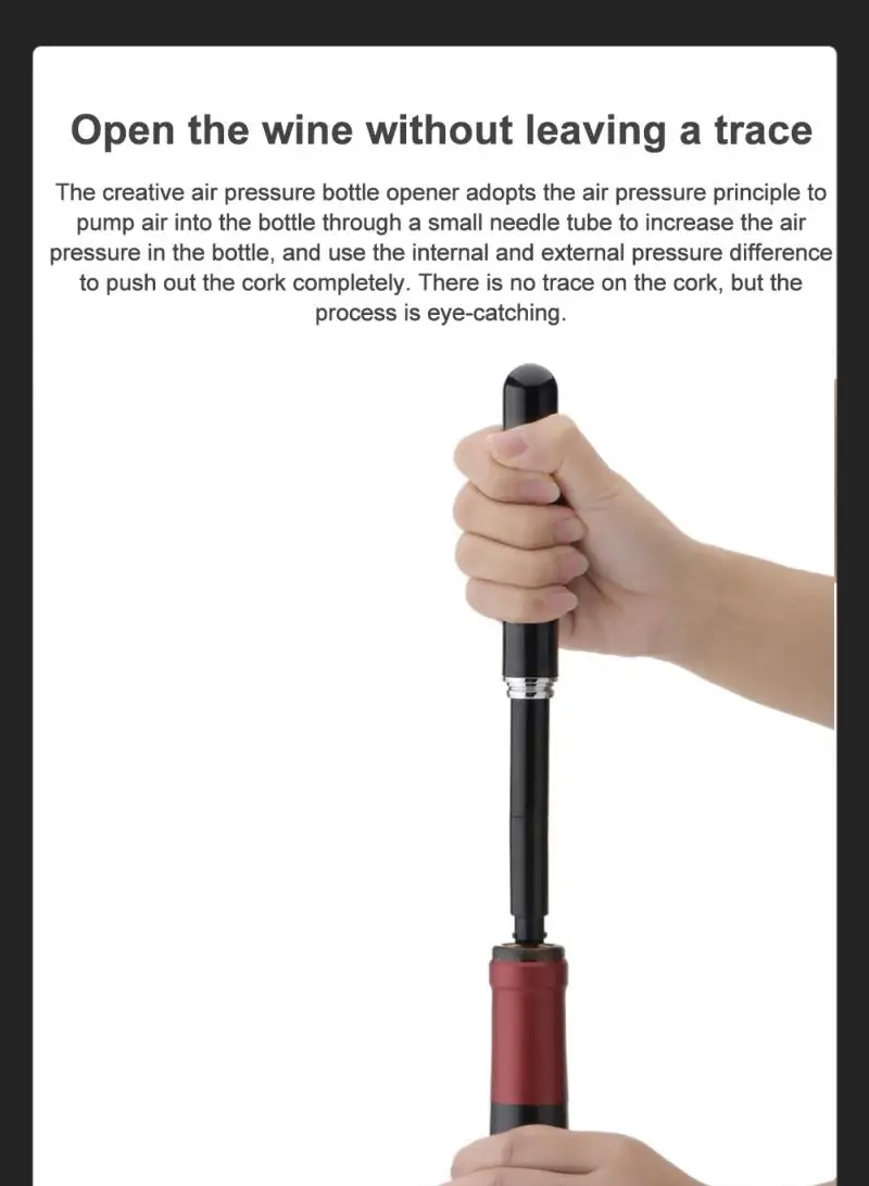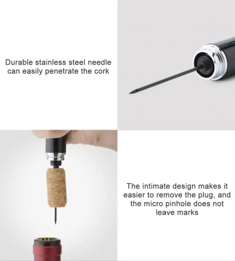 【Эффективный и удобный 】 новейший дизайн, открывалка для бутылок вина под давлением, простой, удобный и весовой светильник. При использовании просто Проколите винную пробку иглой, удерживайте ручку и нарисуйте воздух вверх и вниз 3-7 раз, чтобы вынуть пробку, не разрушая пробку и бутылку, не производит резку древесины. Он чистый и гигиеничный, и используется для многократной очистки.