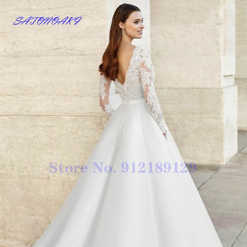 Платье свадебное атласное ТРАПЕЦИЕВИДНОЕ с длинными рукавами и карм...