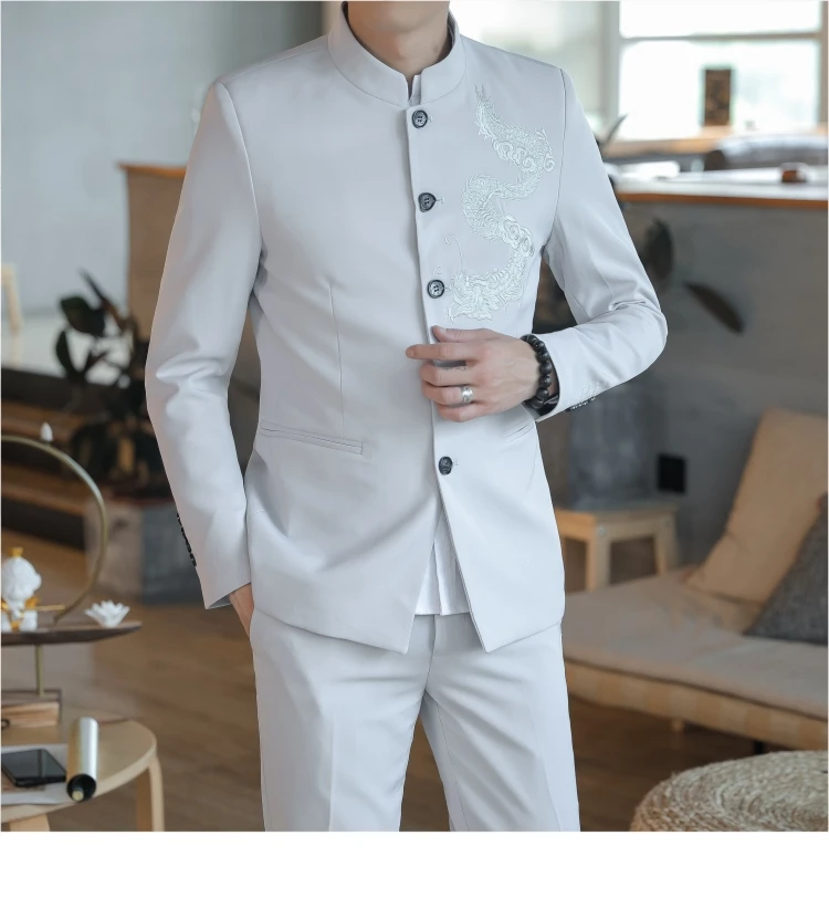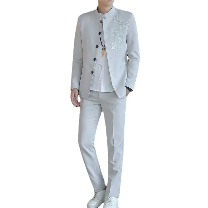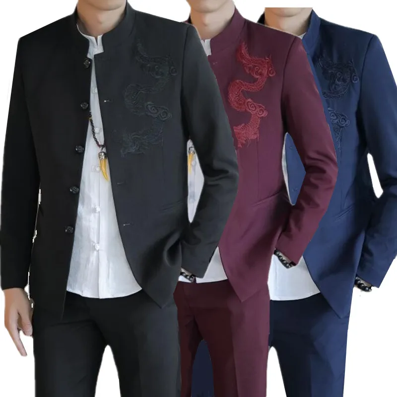 Костюм с вышивкой и воротником-стойкой в китайском стиле, черныевинно-красныетемно-синие приталенные мужские повседневные блейзеры и брюки, размеры 5XL-S