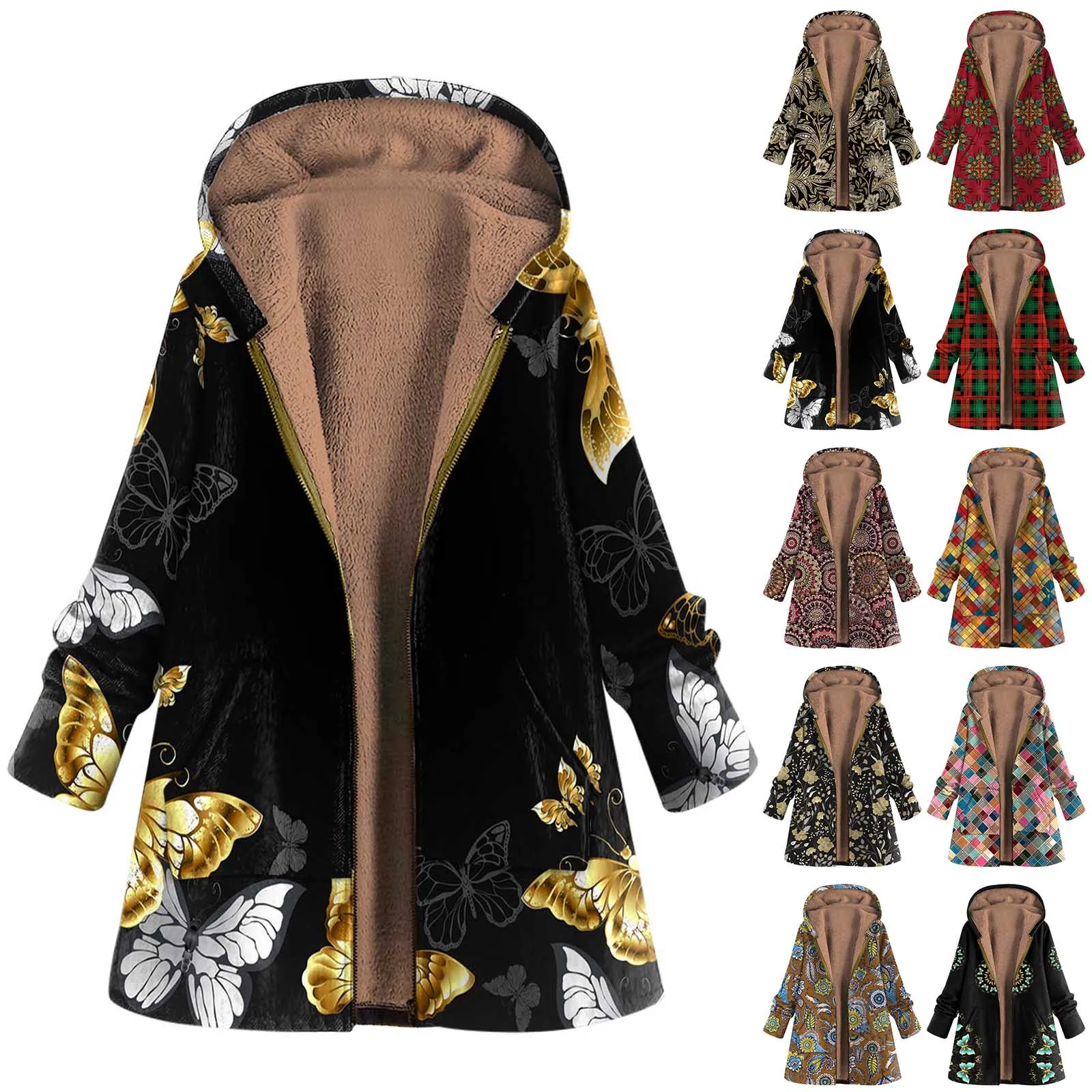 Женское зимнее пальто с винтажным принтом, Толстая теплая плюшевая ...