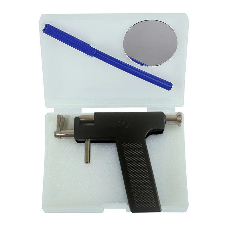 -Мощный Пистолет Для Пирсинга Ушей из нержавеющей стали с 98 стальными шпильками и ручкой. Используется для изготовления отверстий для сережек на ушах.-Легко стерилизуется, так как он полностью металлический.-Плавное рабочее действие со всеми стандартными шпильками для пирсинга.Материал шпилек-нержавеющая сталь.-Подходит для профессионального использования или домашнего использования