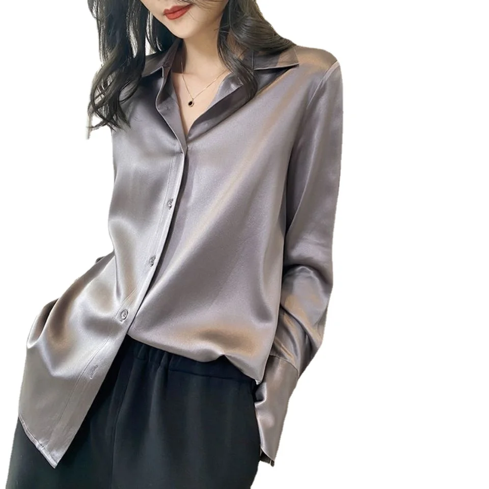 Офисная шелковая атласная рубашка, женская простая блузка, новинка 2022, весенне-осенние Топы, женская одежда, Корейская свободная офисная серая рубашка, блузы для женщин