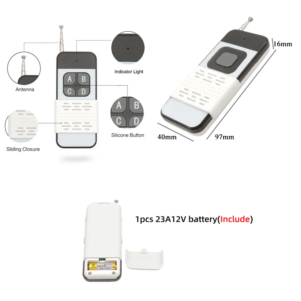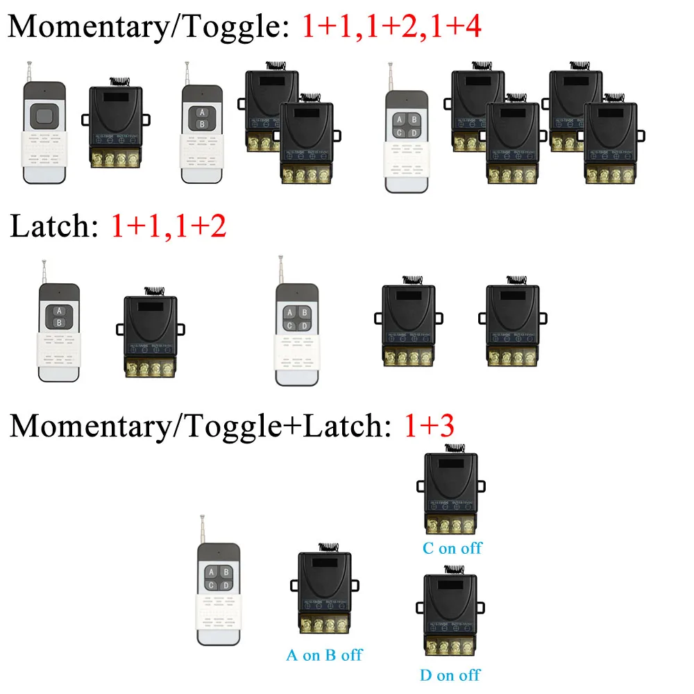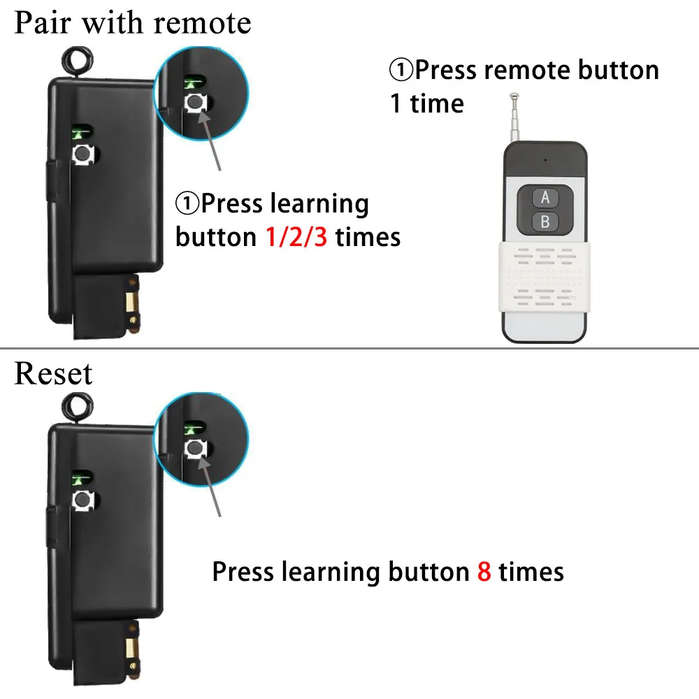 Три режима rf для вас Режим Memontary:Нажмите и удерживайте кнопку дистанционного управления,ПриемникБудет работать. Отпустите кнопку,ПриемникОстановится. Режим переключения:Нажмите кнопку,ПриемникБудет работать. Нажмите кнопку снова,ПриемникОстановится. (в этом режиме вы можете использовать две кнопки дистанционного управления для управления 2 переключателями) Режим блокировки: Нажмите кнопку A, приемник работает, нажмите кнопку B, приемник остановится Как сделать пари с пультами Режим Memontary:Нажмите кнопку обучения на переключателе 1 раз, нажмите любую кнопку дистанционного управления 1 раз, добиться успеха Режим переключения:Нажмите кнопку обучения на переключателе 2 раза, нажмите любую кнопку дистанционного управления 1 раз, добиться успеха Режим блокировки: PНажмите кнопку обучения на выключателе 3 раза, нажмите кнопку 1 раз,Нажмите кнопку B 1 раз,Преуспевает Как сброситьНажмите кнопку обучения 8 раз, чтобы очистить данные, тогда все пульты не могут контролировать этот приемник