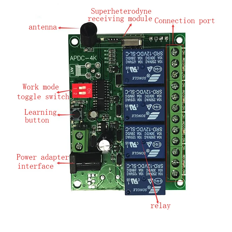Релейный переключатель для гаражных дверей, 433 МГц, 12 В, 24 В постоянного тока, 10 А, 4 канала, радиочастотная Беспроводная система дистанционного управления, приемник, передатчик, 433 МГц, вентилятормотор