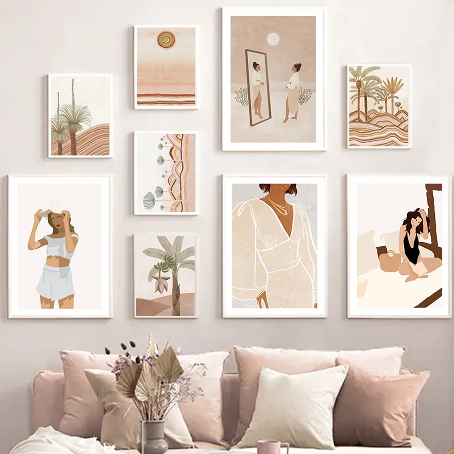 Пейзаж бохо, пальма, девушка, растение, скандинавский винтажный нас...