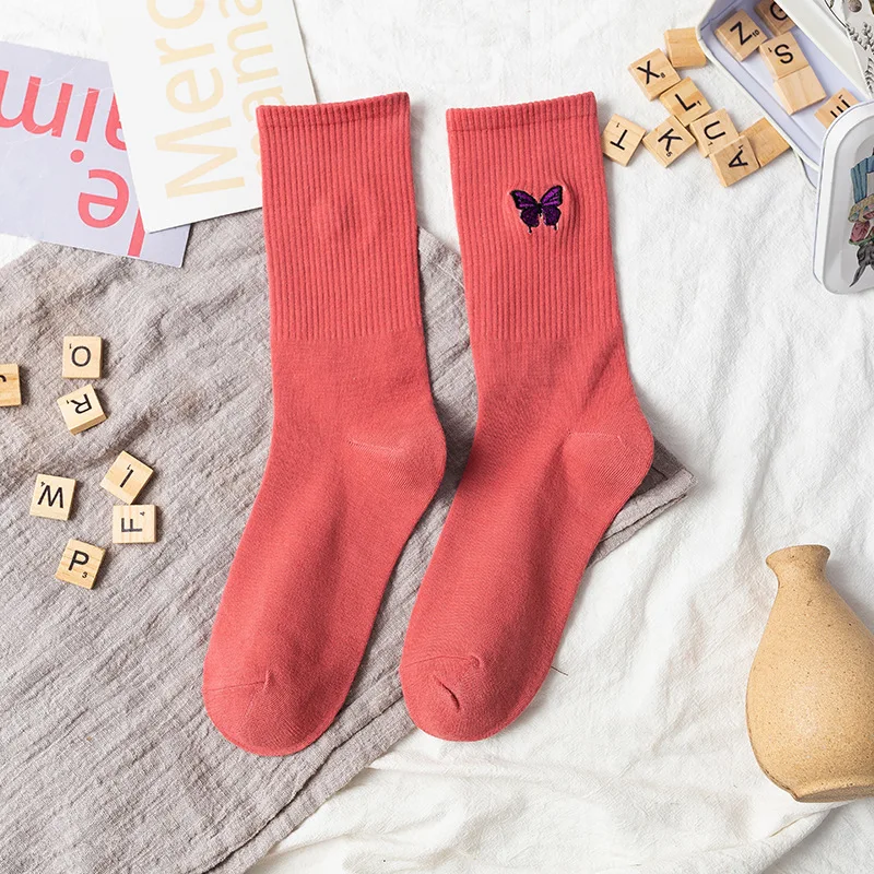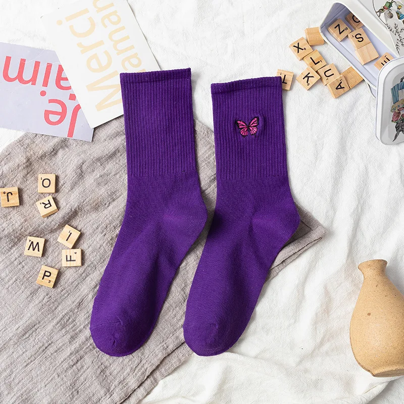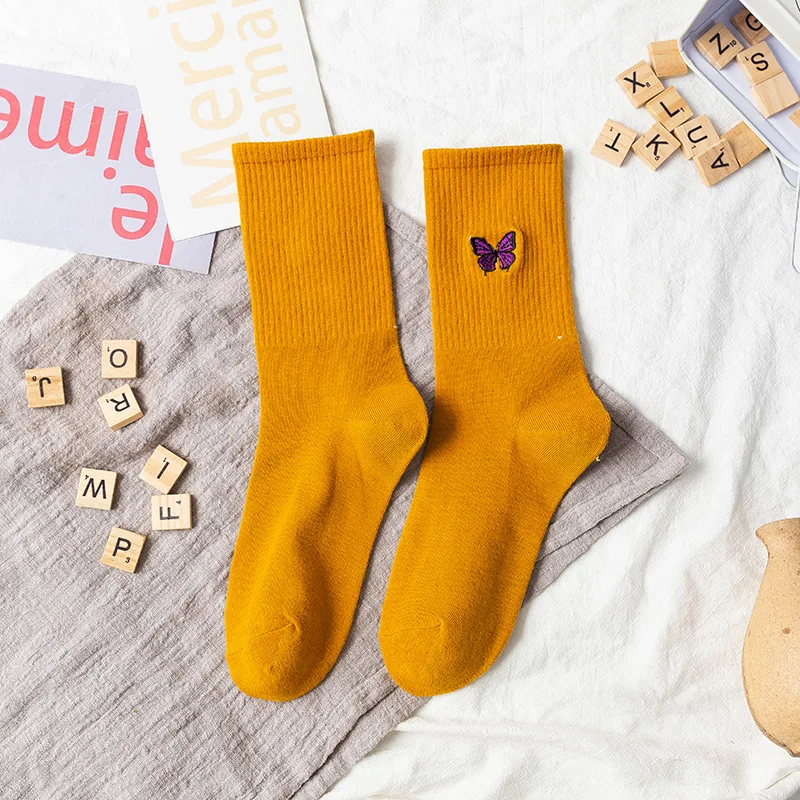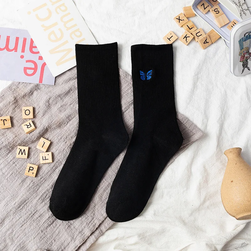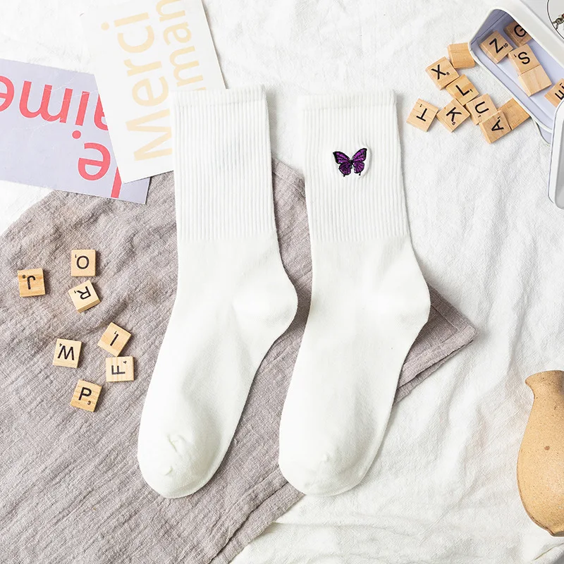 Симпатичные носки с вышивкой бабочки в стиле Харадзюку, женские хлопковые носки в стиле ретро, однотонные зимние носки, женские носки