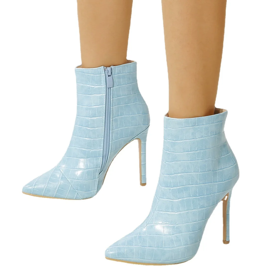 Женские ботинки на тонком каблуке, розовые или Синие ботильоны с острым носком и меховым принтом, обувь для фетиша и стриптиза, 2022