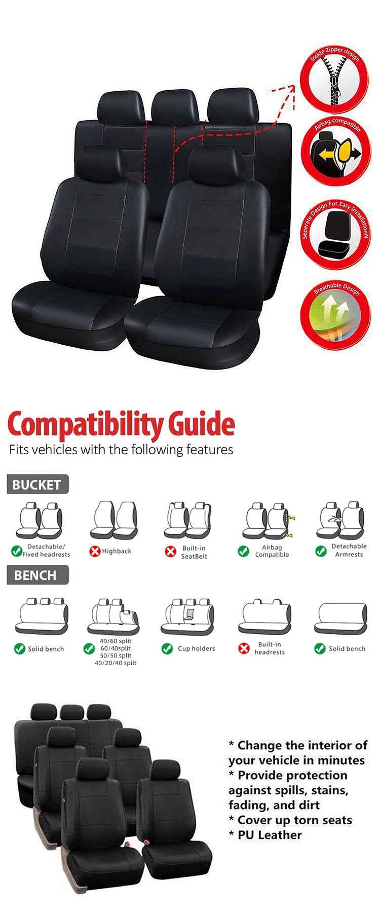 Материал-прочный кожаный материал, водонепроницаемый и легко чиститсяПодходит практически для всех транспортных средств, как для передних, так и для задних сиденийБыстрая установка-надевайте и снимайте в течение 3 секундЛегко складывается для хранения, эластичный ремешок для завязыванияС застежкой-молнией-задняя крышка сиденья имеет дизайн молнии, не влияет на использование держателя чашки