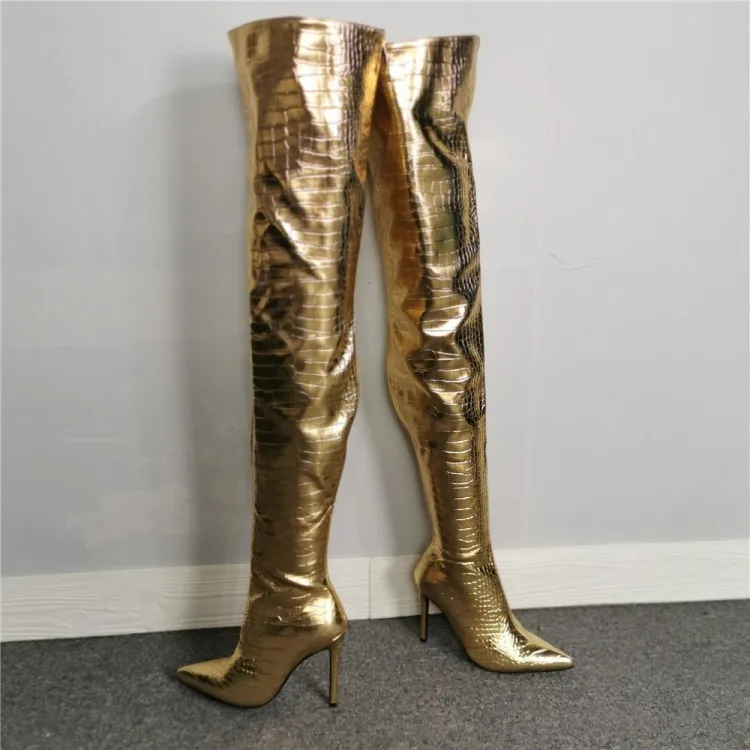 Золотистые глянцевые высокие сапоги на шпильке с острым носком, женские зимние сапоги выше колена на молнии с крокодиловым узором из искусственной кожи