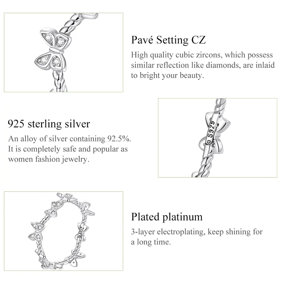 ❤[Опишите] кольцо с платиновым покрытием имеет нежную и блестящую текстуру и имеет множество изысканных бабочек с цирконами. Он стильный, элегантный и уникальный.❤[Материал] 925 пробы серебристого и эмалевого процесса и окисленного серебра, этот серебряный шарм не содержит никель, не содержит свинец, не содержит кадмия, гипоаллергенен. Гарантия качества, приятный для кожи, удобный и удобный в носке, не вредный для здоровья.❤[Мастерство]:S925 + Pavé установка CZ + покрытая платиной❤[Параметры]: Ширина: 0,5 см❤[В подарок] 1 шт. серебряное кольцо 925 пробы и Подарочная коробка, что является идеальным подарком.