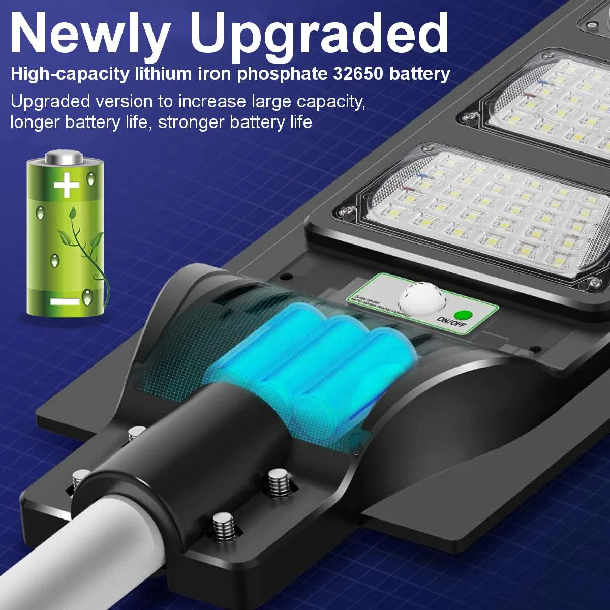 【Обновление панели солнечных батарей 】30/60/90 яркий светодиодный, мощный 7000/14000/21000 люмен выход солнечного света. Литиевый фосфатный аккумулятор 16000/24000/30000 мАч является взрывозащищенным, обеспечивая долгосрочное освещение и долговечность, обеспечивая хорошее освещение для вашего гаража, сада и прохода.