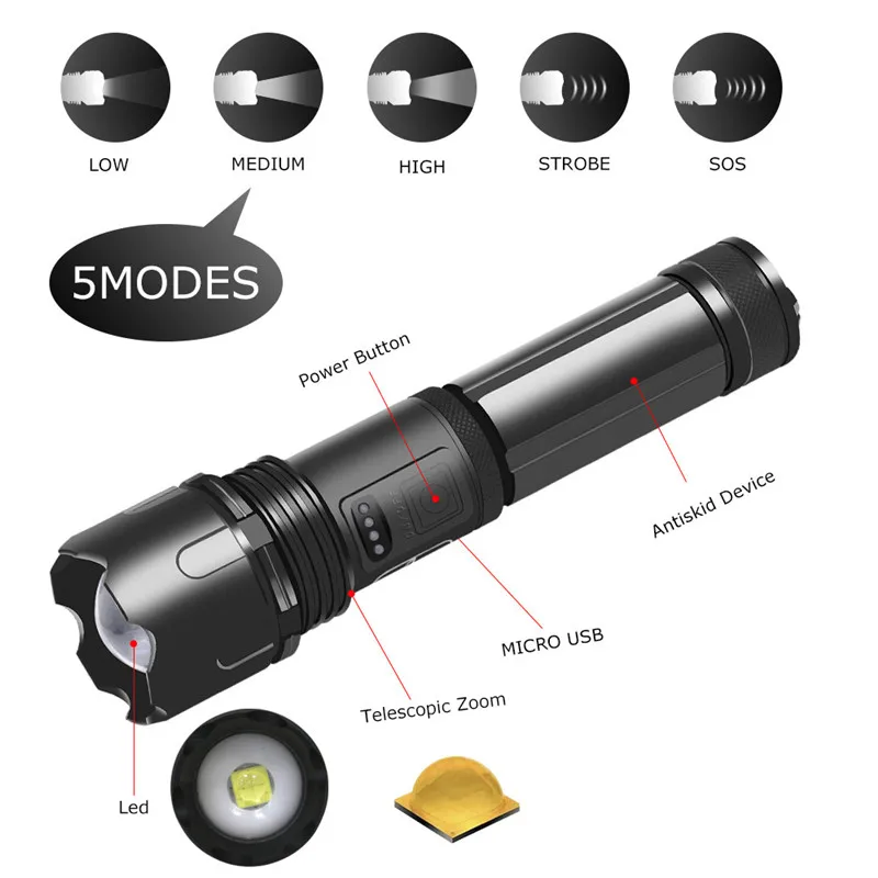 Мощный светодиодный фонарик с 5 режимами: полный, средний, низкая яркость, стробоскоп и SOS, вы можете переключаться по желанию, адаптироваться к различным условиям освещения. Кроме того, функция масштабирования более практична, прожектор для дальнего наблюдения и прожектор для освещения большой площади.