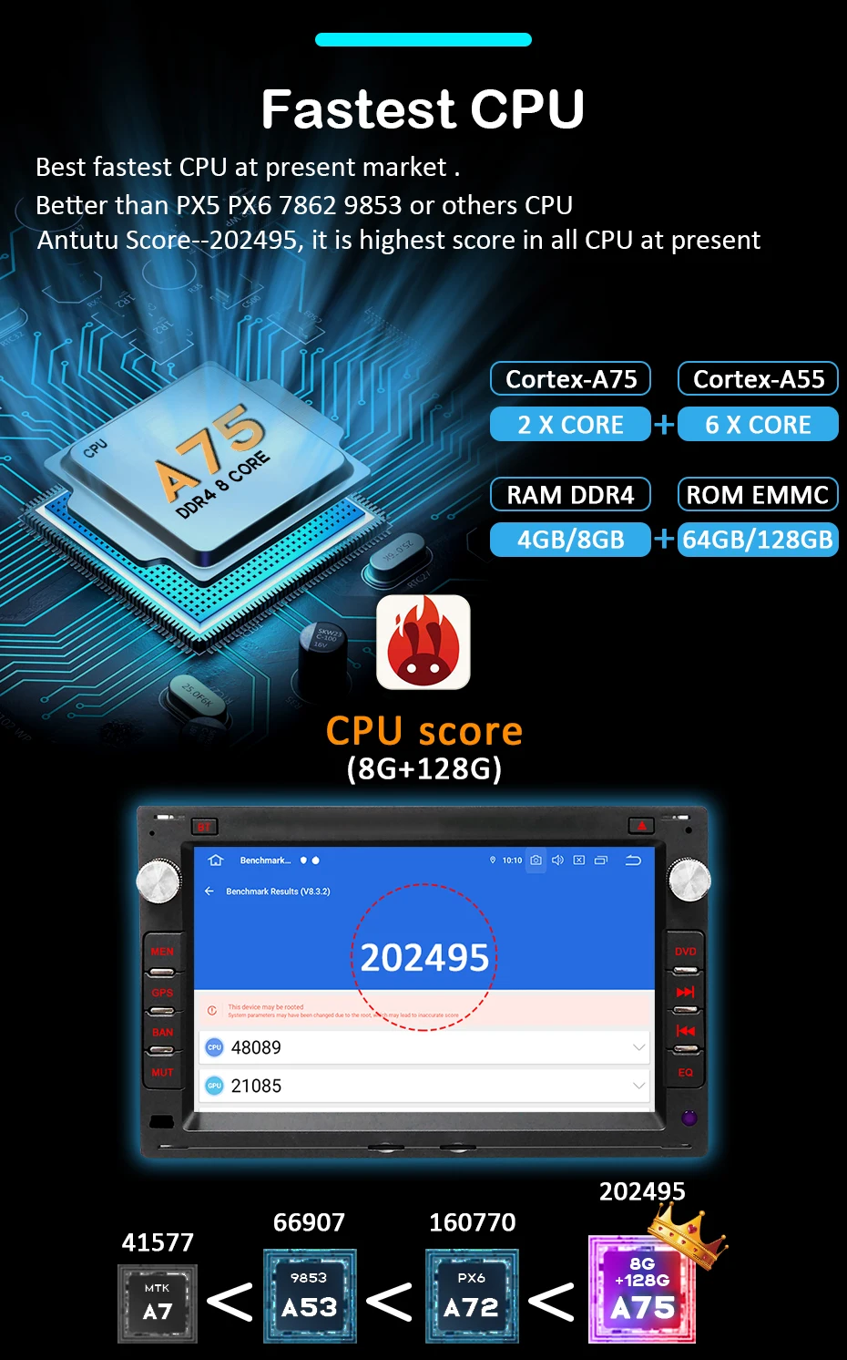 Самый быстрый процессор Самый быстрый процессор на современном рынке. Лучше, чем PX5 PX6 7862 9853 или другие ЦП Antutu Score- 202495, это самый высокий балл во всех ЦП в настоящее время