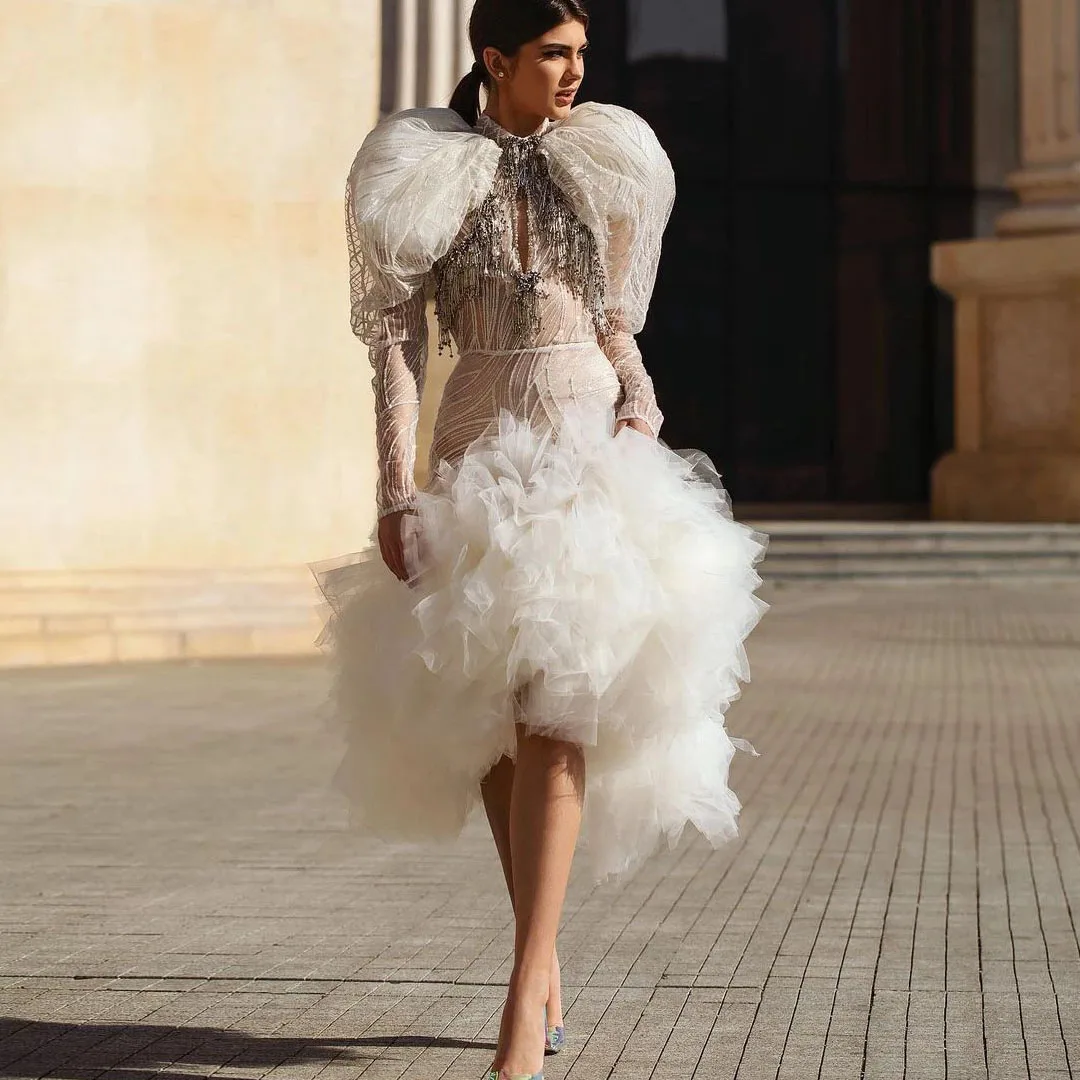 Изысканные блестящие короткие платья для выпускного вечера, коктейльные платья до колена с высоким воротником и пузырьковыми рукавами, платье из тюля с бисером и бахромой и оборками