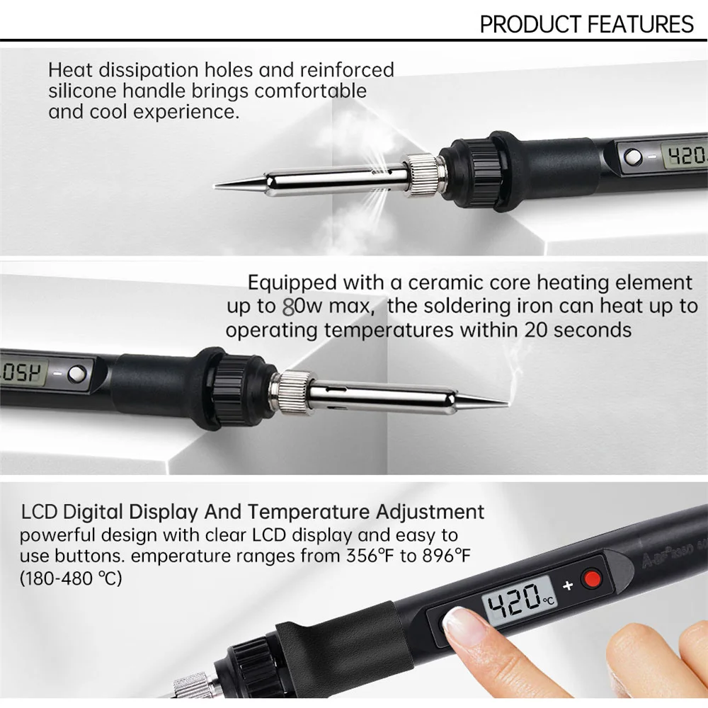 Этот паяльник является 80 Вт сварочным инструментом, который может работать в 180C -480C. Температура может быть скорректирована 1С. Он имеет штепсельную вилку ЕС и США на выбор.