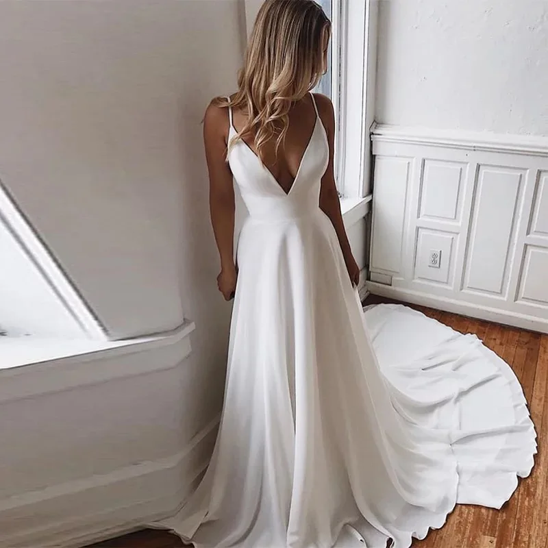 Женское свадебное платье на тонких бретельках, элегантное платье с V-образным вырезом, трапециевидной формы со шлейфом, 2022