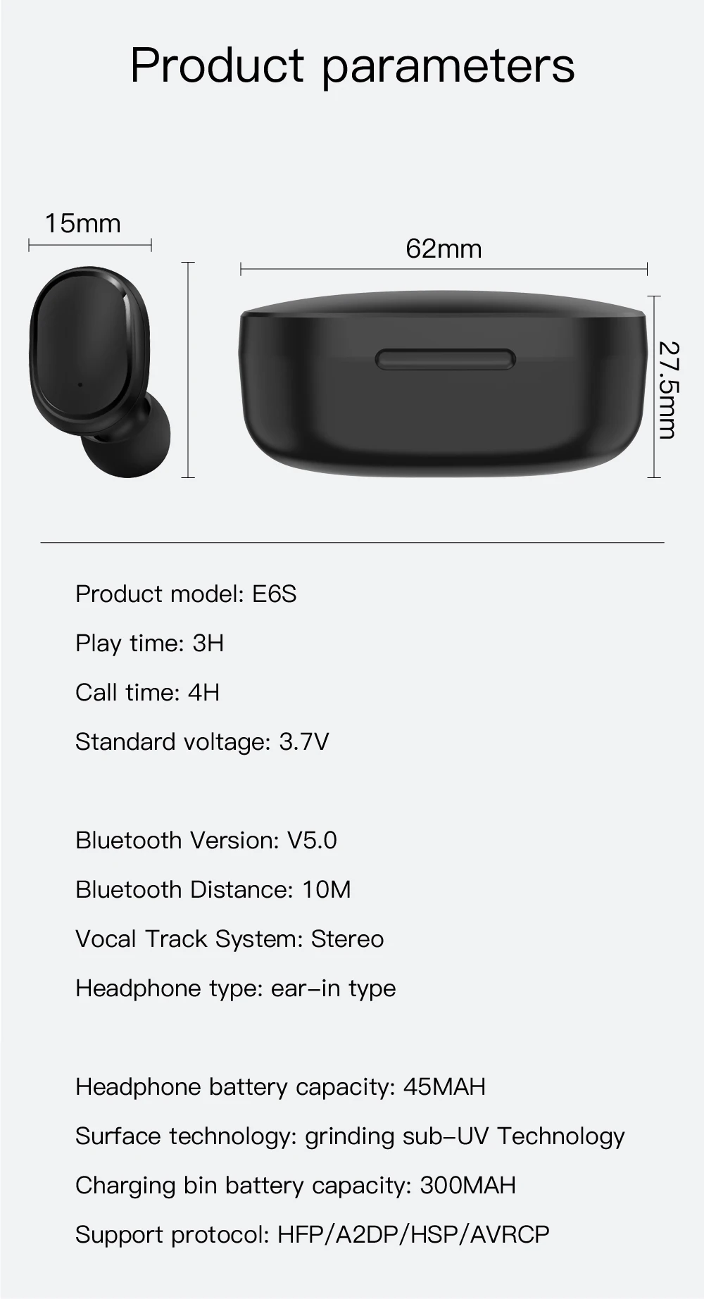 Номер товара: E6SВерсия Bluetooth: Bluetooth V5.0. Батарея Спецификация: гарнитура 3,7 V/для использования на глубине до 45 м Ач: зарядным устройством7 в/280 мАчРежим поддержки: HFP/HSP/ A2DP/AVRCPЧувствительность: 105 дБ + 3 дБ S P L при 1 кГцРасстояние передачи: 10 метров (в идеальной среде без каких-либо основных препятствий)Время непрерывной работы: около 2,5 часовВремя вызова: около 3 часовВремя работы в режиме ожидания: около 80 часовВремя зарядки: зарядите зарядное гнездо около 1,5 часовИ заряжайте гарнитуру около 1 часаЗарядным устройством для зарядки наушников: около 2,5 разПосылка:2xBluetooth наушники1 зарядное устройство xEndurance1 кабель для зарядки1X Руководство пользователя1xEarplug силиконовая крышка