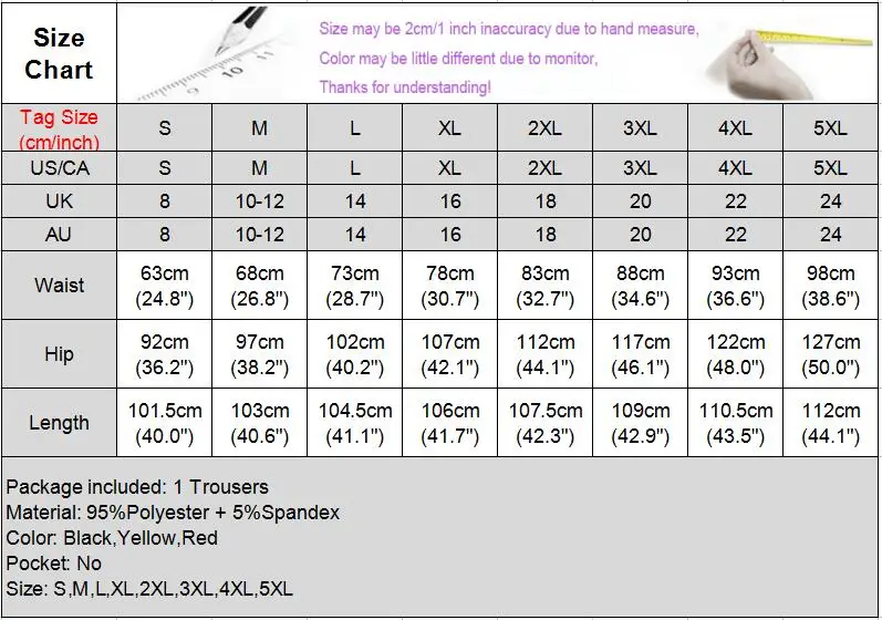 Посылка включает в себя: 1 брюкиМатериал: 95% полиэстер + 5% спандексЦвет: черный, желтый, красныйКарман: нетРисунок: однотонныйДлина: полная длинаОсобенности: кнопкаСтиль: Повседневный, праздничный, досуг, ретроСезон: 4 сезонаПовод: Семейные, вечерние, свадебные, праздничные, рабочие, туристическиеВнимание:1. Перед покупкой, пожалуйста, проверьте размеры в таблице размеров!2. Размер может быть неточным на 2 см/1 дюйм из-за ручного измерения, цвет может немного отличаться из-за монитора, спасибо за понимание!3. Предложение холодной воды ручная стирка. Это может помочь предметам сохранить свою форму.