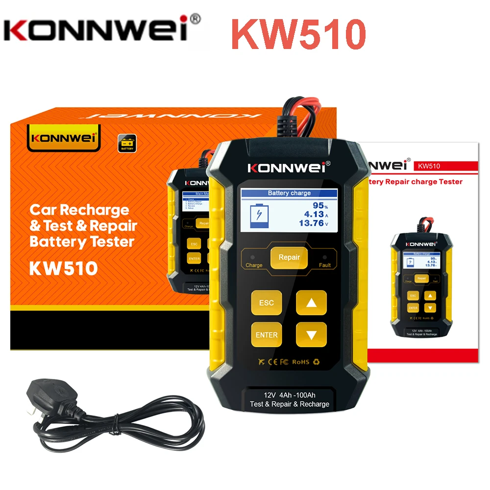 Тестер автомобильных аккумуляторов KONNWEI KW510, 12 В, полный автоматический импульсный ремонт, 5 А, зарядные устройства, влажная сушка, AGM Gel, свинцово-кислотный инструмент для ремонта автомобиля