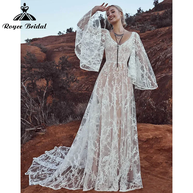 Очаровательные богемные Свадебные платья а-силуэта с кружевной аппликацией и V-образным вырезом с длинными расклешенными рукавами и открытой спиной, свадебные платья, платье для невесты, свадебное платье