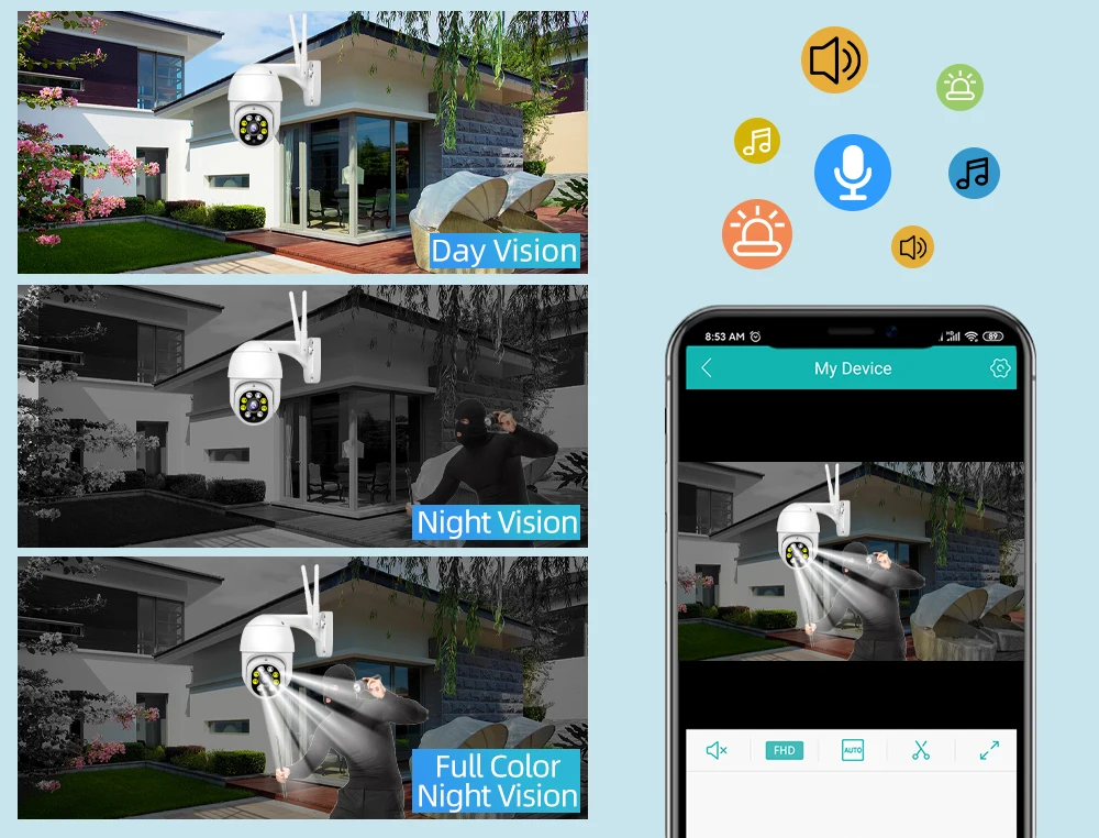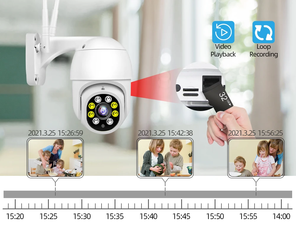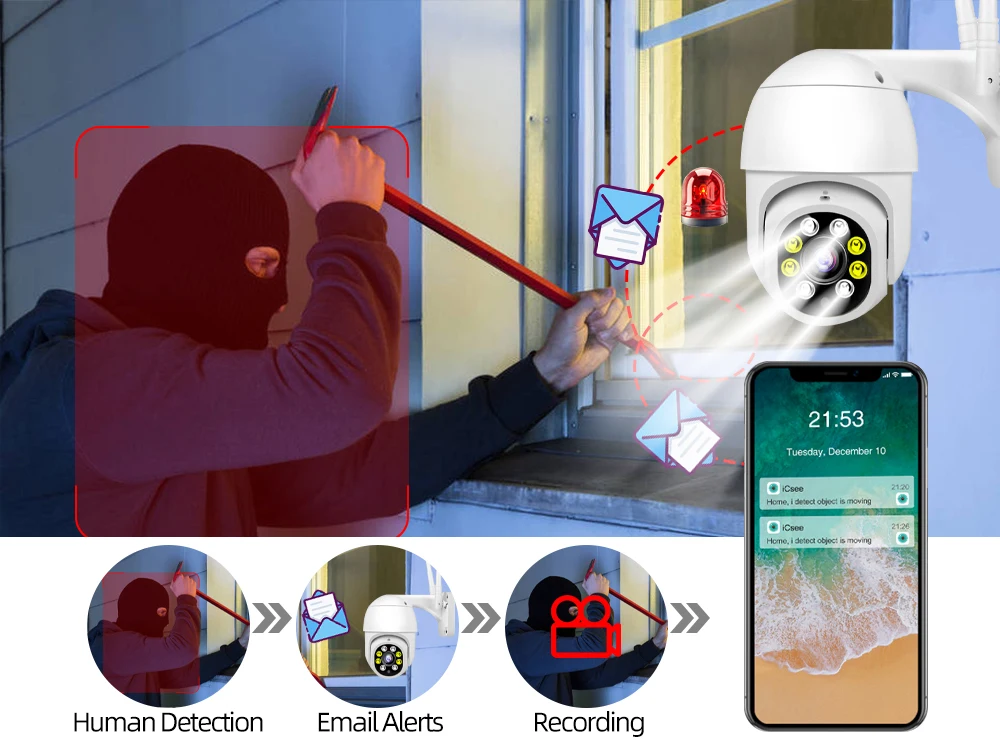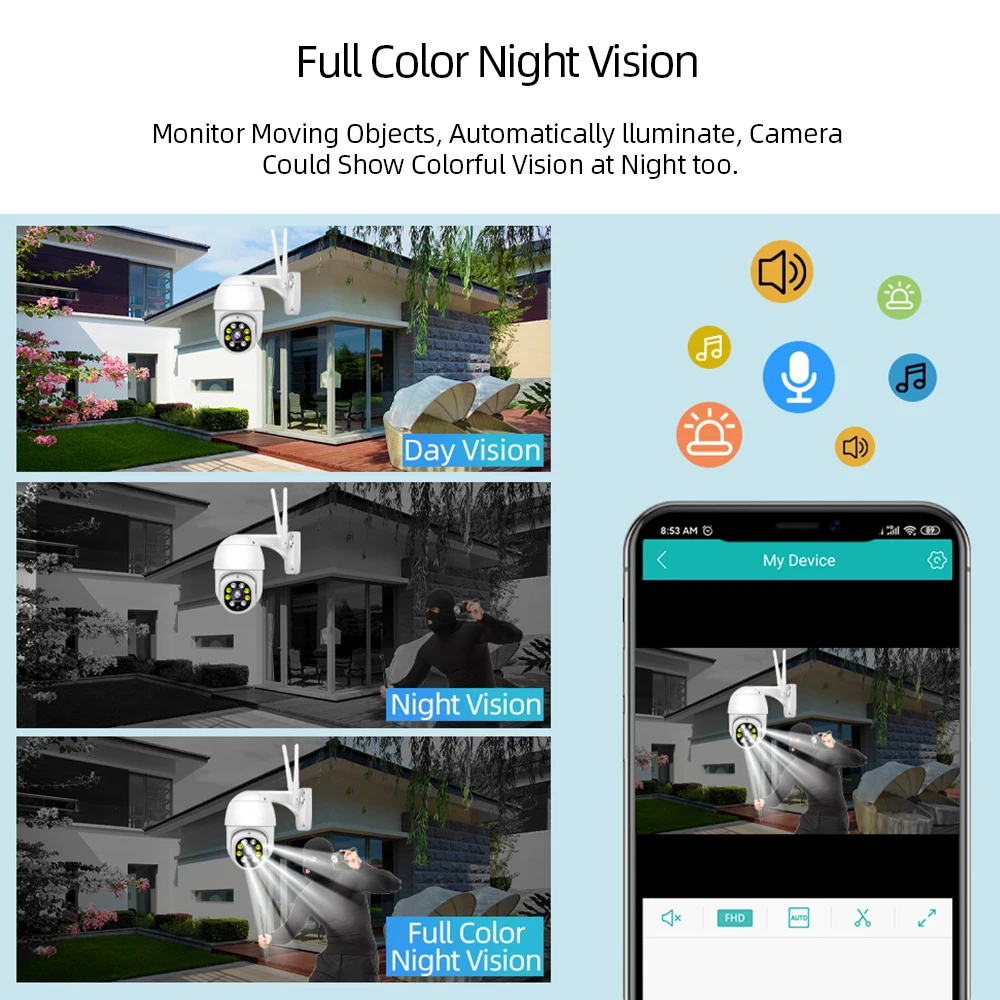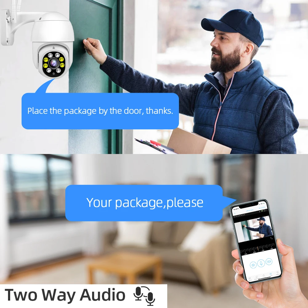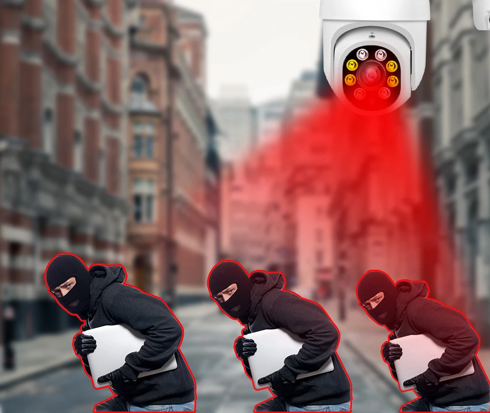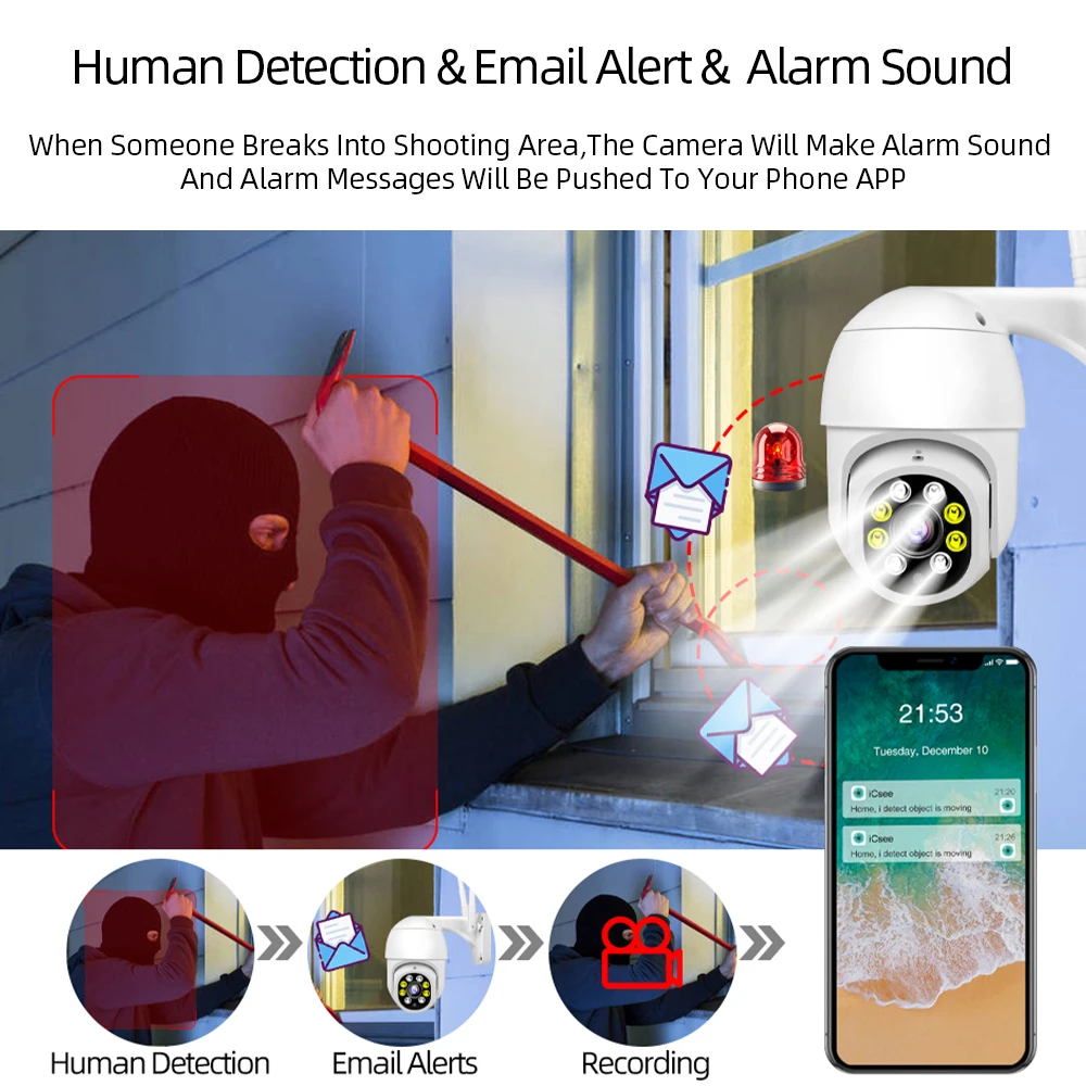 Когда кто-то ворвется в область съемки, камера сделает звуковой сигнал и сигнал тревоги будет передвинут в приложение вашего телефона. И когда он обнаруживает движение, 4 белый светодиодный светильник s будет светильник, показывая вам цвет ночной сцены.