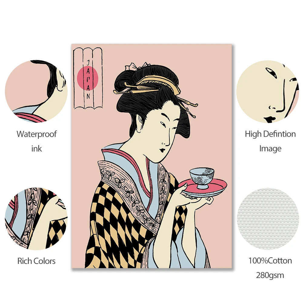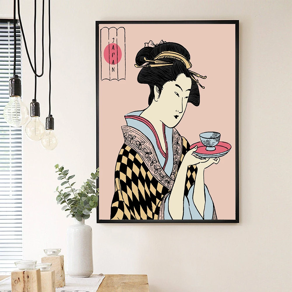 Кимоно для женщин в японском стиле, холст с рисунком чайной чашки, сине-зеленый постер и печать, ретро рисунок гейши, настенное художественное украшение для чайного дома