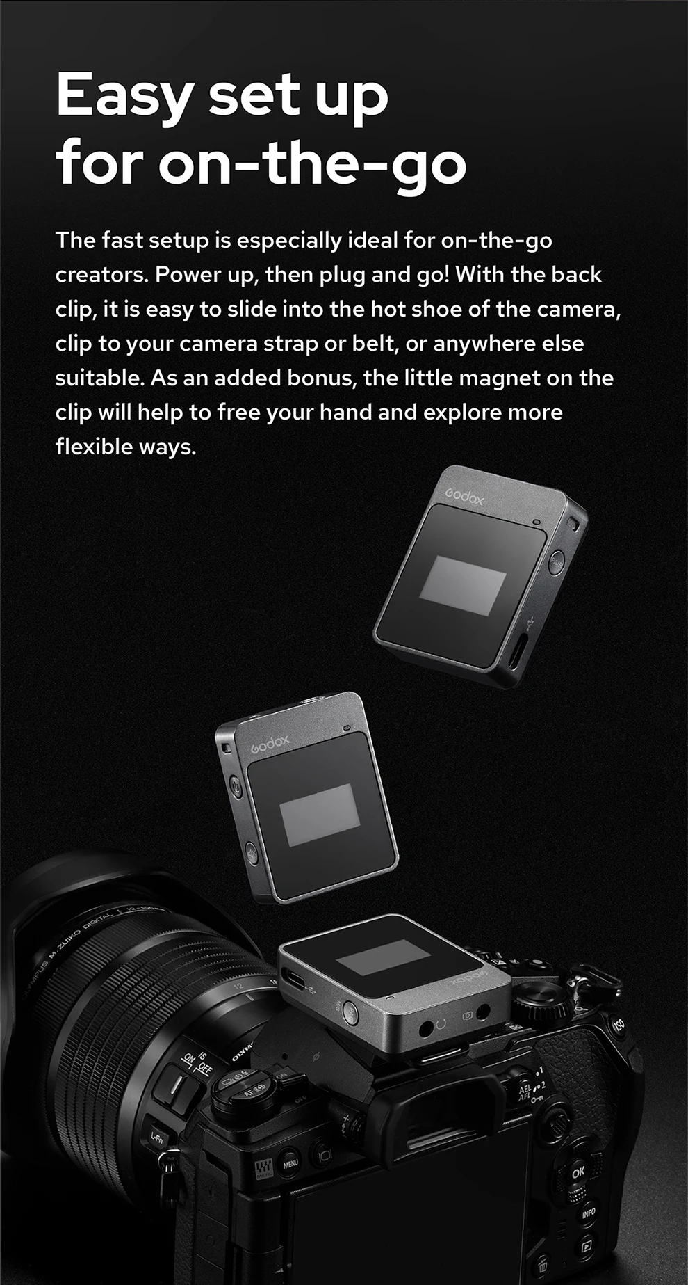 Кнопка отключения звука на передатчикеЗаряжает две батарейки одновременно (батарейки в комплект не входят) искать кабели для зарядки!Двухканальные зажимы приемника для башмака камерыРегулируемая Выходная громкость на приемникеПриемник предлагает режимы моно-и стереовыхода6 часов работы на встроенных аккумуляторахКомпактная, легкая беспроводная система для видеосъемки, интервью и производства видеоРаботает со смартфонами, камерами и аудиозаписывателями с входным разъемом 3,5 ммЦифровая беспроводная передача частоты в спектре 2,4 ГГцTFT дисплеи на компонентах показывают важную информацию, включая Время работы батареи, уровни, состояние отключения звука и многое другое