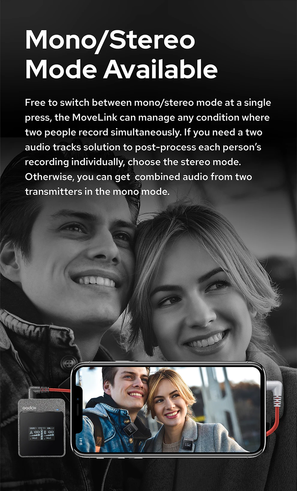 1. Операционная система 2,4 ГГц: поддерживаемый во всем мире диапазон частот 2,4 ГГц позволяет избежать помех от перегруженных UHF, что гарантирует высокую производительность как на месте, так и в помещении. Благодаря максимум 50 метров рабочее расстояние, обеспечивает соответствие требованиям большинства занятий на открытом воздухе.2. Портативный зарядный чехол: такого же размера, как и смартфон, чехол идеально помещается в карман и может свободно носить с собой. Положите в него три блока, и вы можете заряжать их вместе только с одним кабелем type-c.3., меньше, чем маленький: Godox MoveLink супер легкий и просто помещается в карман. Каждая единица измерения в 5*4*1,4 см позволяет легко держать всю систему в одной руке.4. Моно/стерео режим доступен: свободно переключаться между моно/стерео режимом, MoveLink может управлять любым состоянием, где два человека записывают одновременно.5. Высокая совместимость: с входящими в комплект кабелями TRS и TRRS 3,5 мм Godox MoveLink совместим с несколькими устройствами, такими как смартфоны, планшеты, камеры, рекордеры и т. Д.;