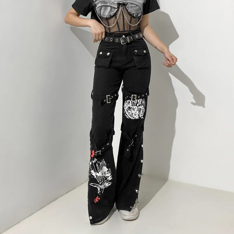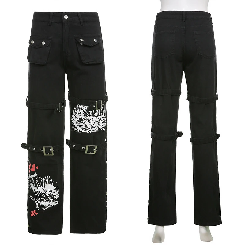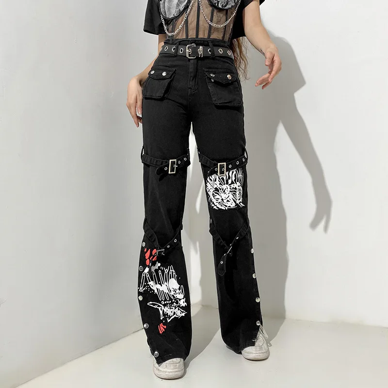 Черные женские джинсы Y2k в стиле панк и готика с застежкой-ушками,...