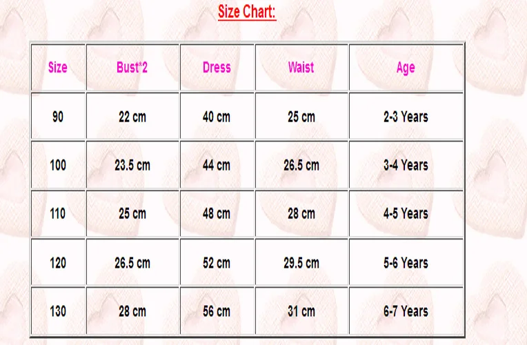 Размеры Бюст * 2 Платье Талия Возраст 90 22 см 40 см 25 см От 2 до 3 лет 100 23,5 см 44 см 26,5 см От 3 до 4 лет 110 25 см 48 см 28 см От 4 до 5 лет 120 26,5 см 52 см 29,5 см От 5 до 6 лет 130 28 см 56 см 31 см От 6 до 7 лет Разница в 2-3% в соответствии с измерениями вручную.Прежде чем купить эту товарную позицию, просим тщательно свериться с таблицей размеров.1 дюйм = 2,54 смОбратите внимание что небольшая разница в цвете считается приемлемой. Это может быть связано с положением источника света и с настройками экрана.