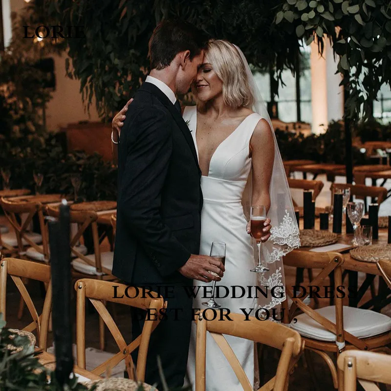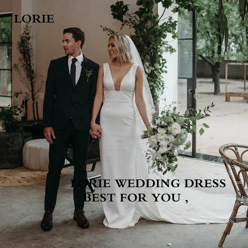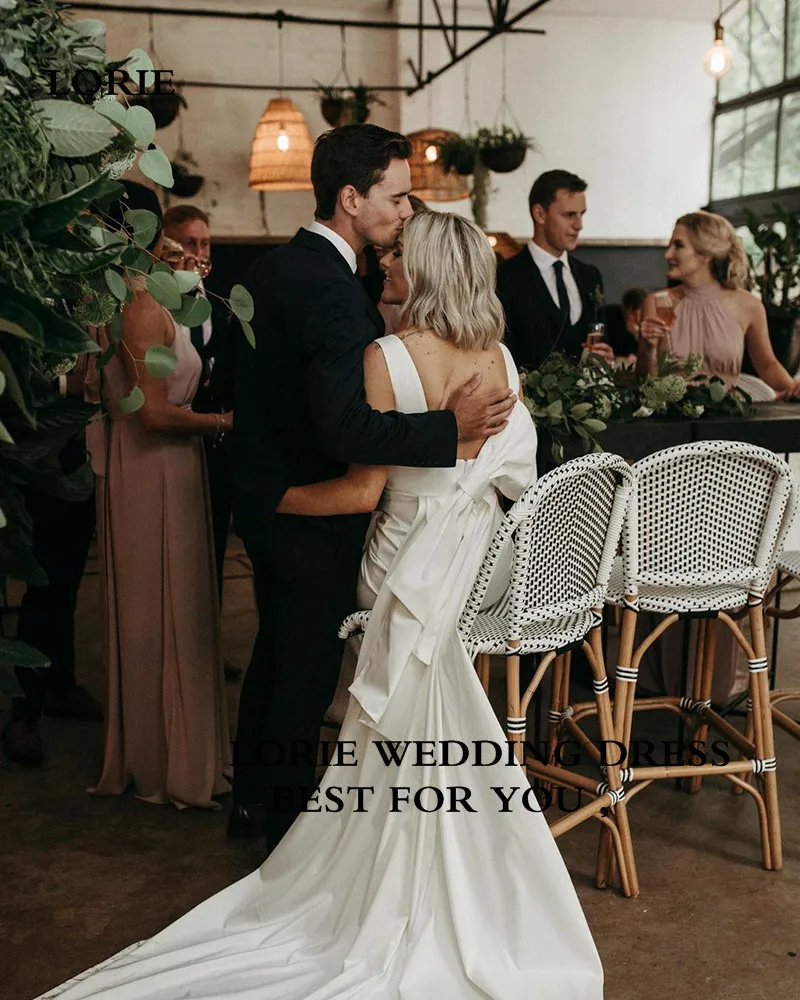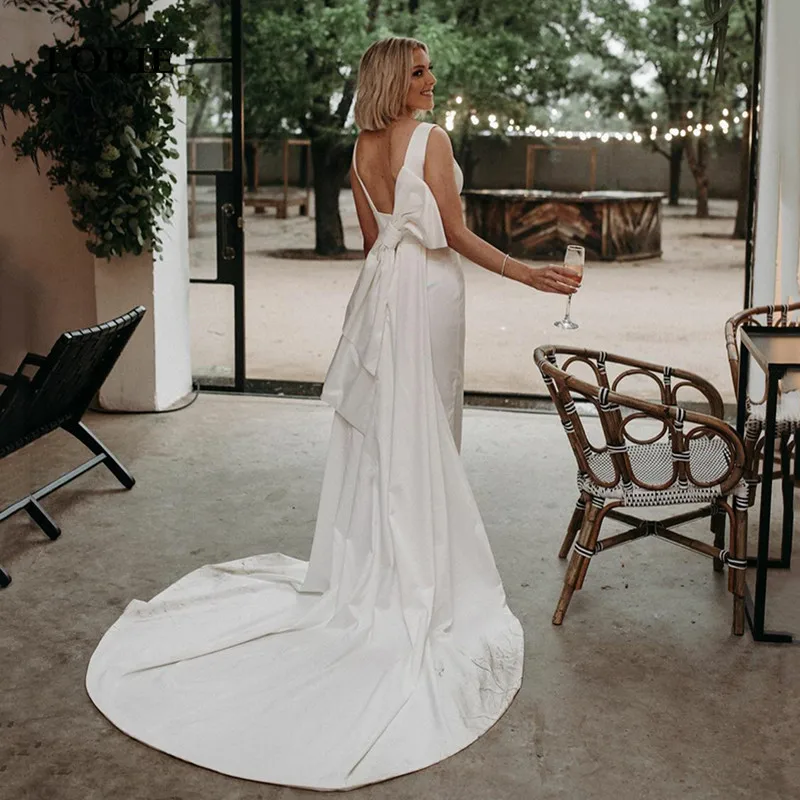 Платье свадебное атласное со съемным шлейфом, бантом и V-образным вырезом