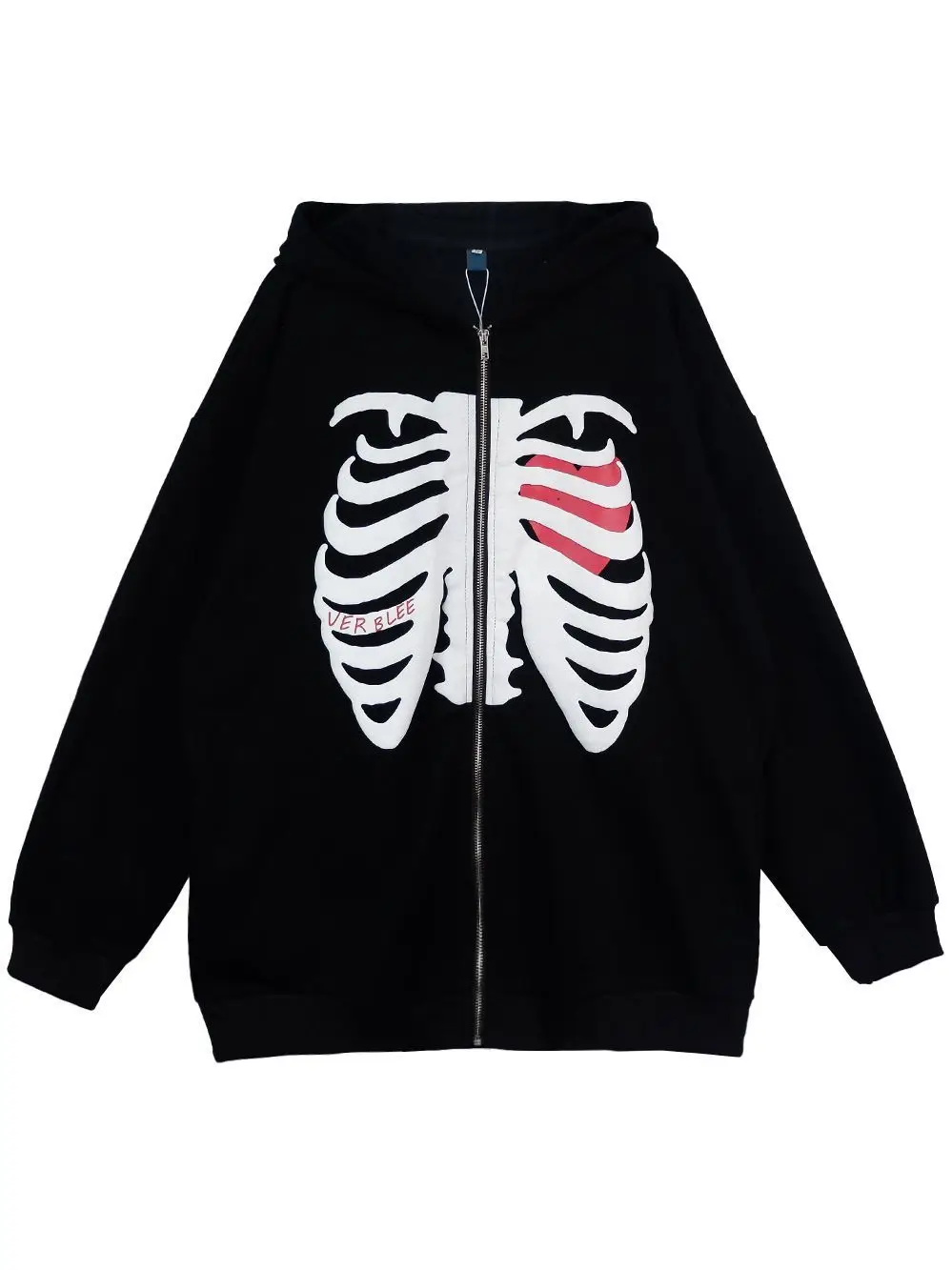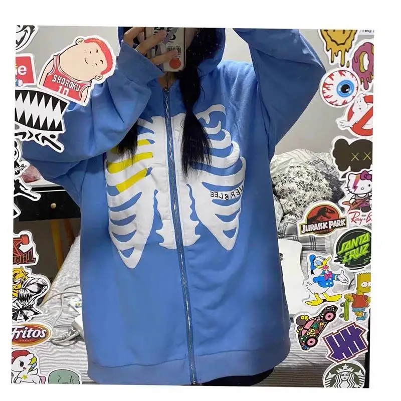 Худи с принтом скелета для мужчин и женщин Y2K Harajuku куртка на молнии с длинным рукавом ретро с капюшоном Толстовка Оверсайз Готический гранж уличная одежда