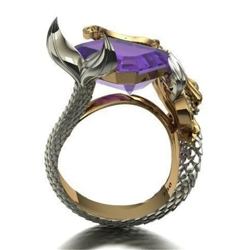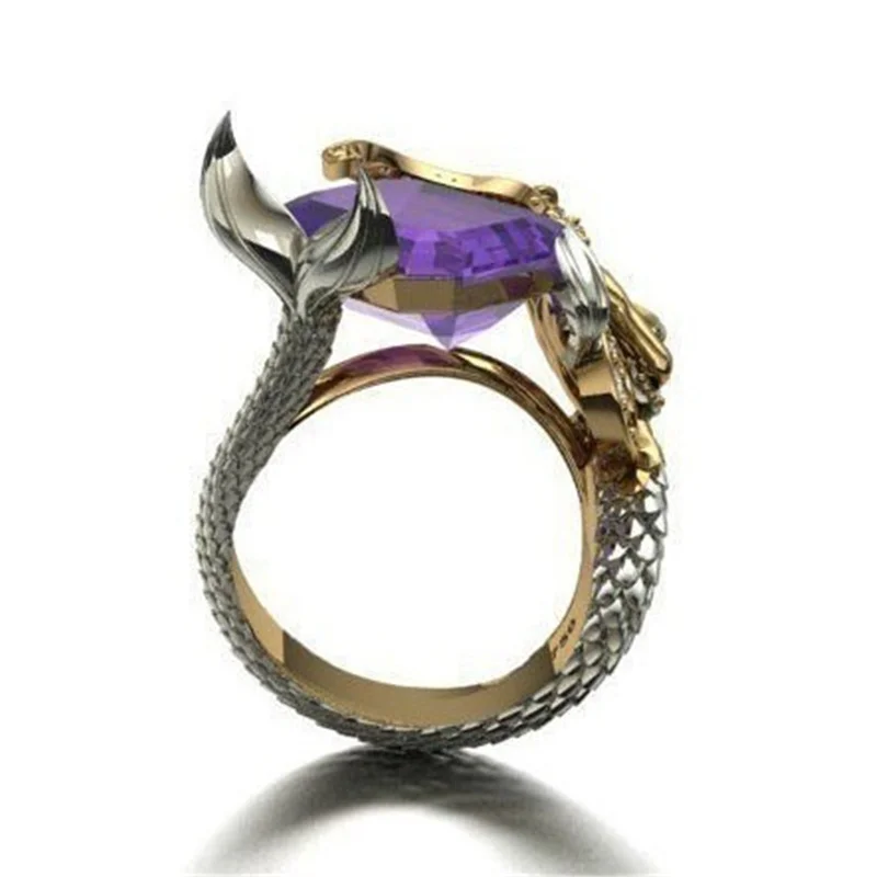 Женское модное креативное Золотое двухцветное кольцо с аметистом русалки, Крутое мужское кольцо высокого класса, стильное дизайнерское кольцо, ювелирное изделие, подарок 2021