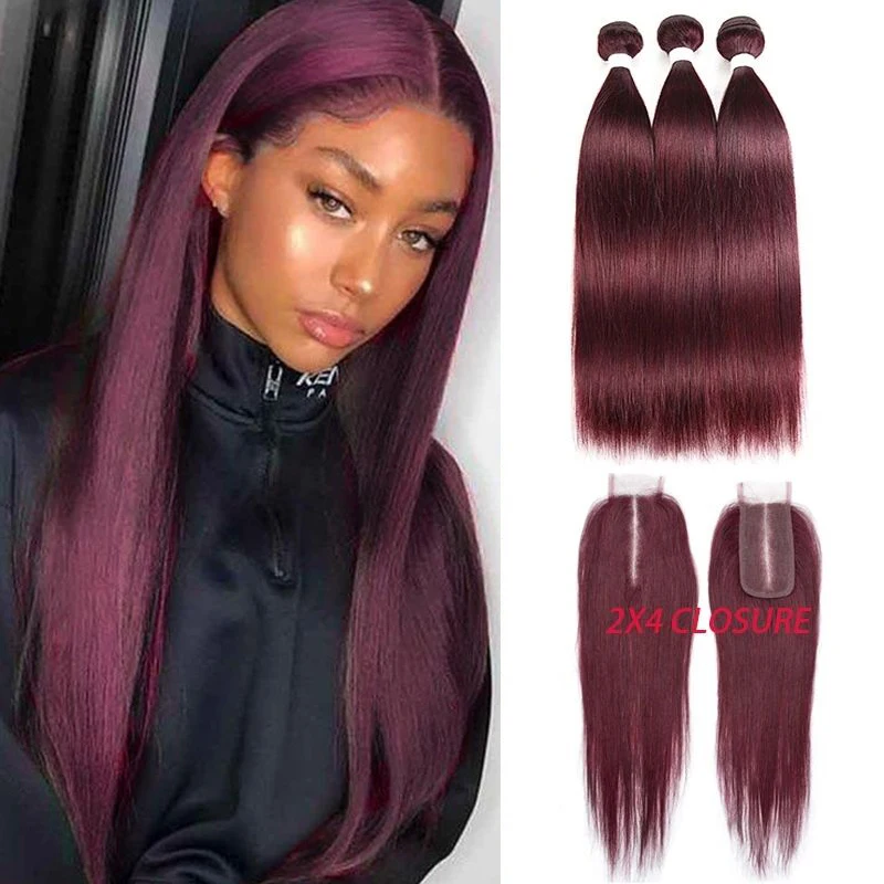 99J бордовый темно-красный 2 #4 # шоколадный светильник медово-коричневые прямые пряди человеческих волос с закрытием бразильские пряди волос с закрытием бордовый 4x2 кружево