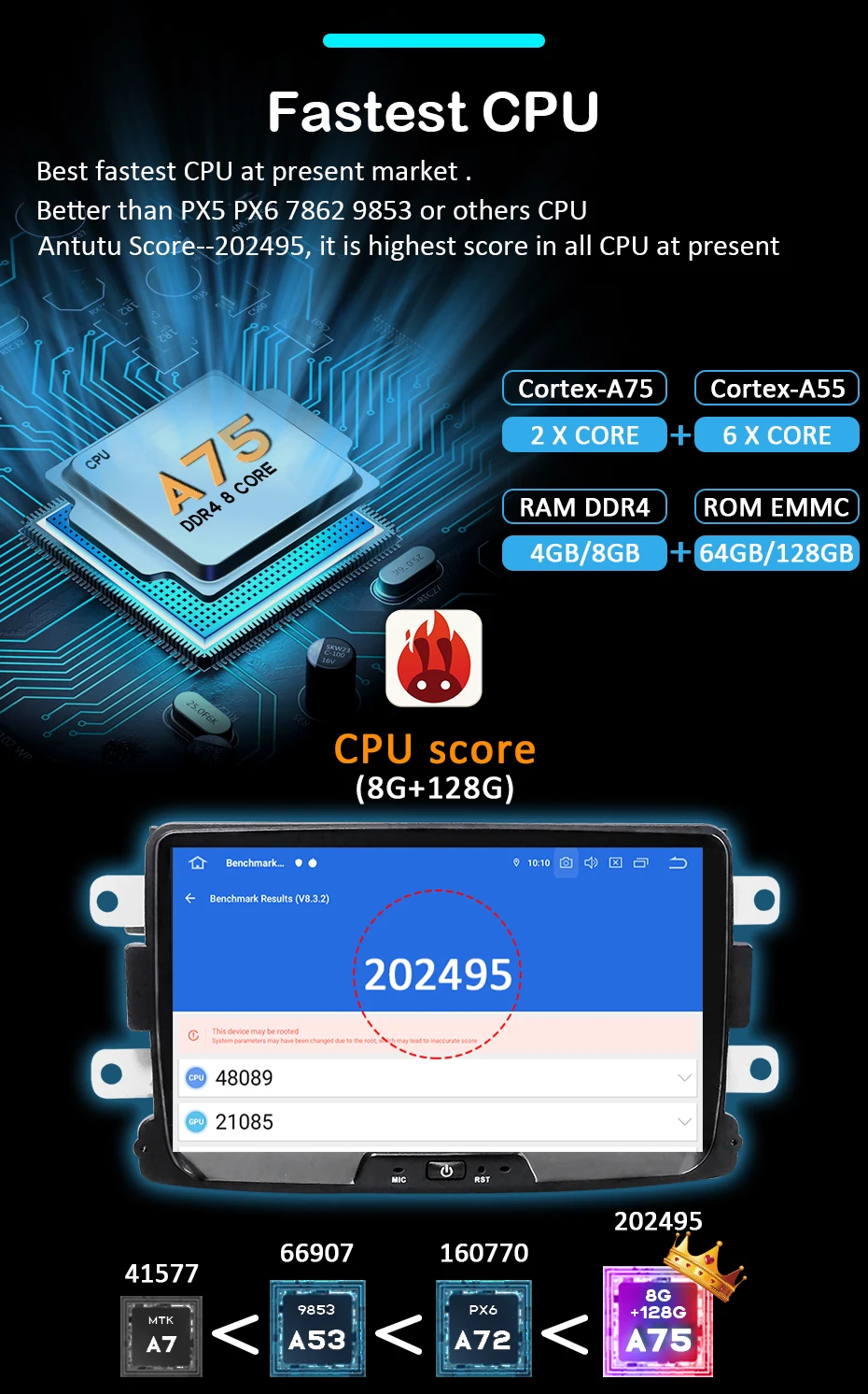 Самый быстрый процессорСамый быстрый процессор на современном рынке.Лучше, чем PX5 PX6 7862 9853 или другие ЦПAntutu Score- 202495, это самый высокий балл во всех ЦП в настоящее время