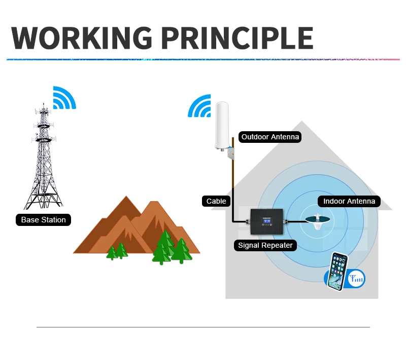 Высокие горы, здания или бетонные стены барьеры сигнал отправляется с базовой станции, потому что нет сигнала внутри комнаты.Установите наружную антенну на высоком месте, чтобы поймать great signal→ кабель передаст catched сигнал на устройство→ Усилитель сигнала усиливает сигнал → Внутренняя антенна передает усиленный сигнал→ Состояние сигнала внутри помещения становится хорошим