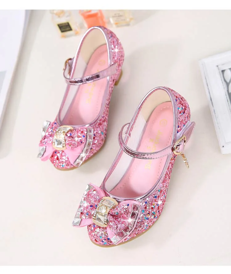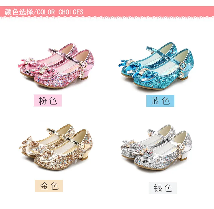 Детская кожаная обувь принцессы для девочек; Повседневная блестящая детская обувь на высоком каблуке с бантом-бабочкой; Цвет синий, розовый, серебристый