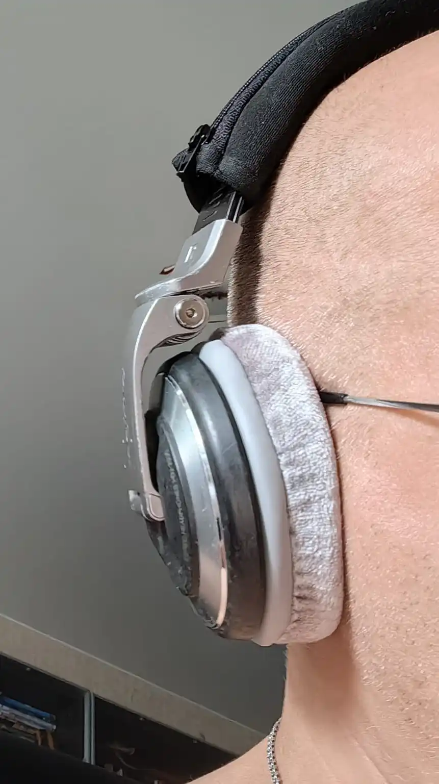 Защелкните заднюю часть наушников в монтажный шов на боковой стороне наушников. Затем медленно вытяните спину в шов вручную, чтобы завершить установку