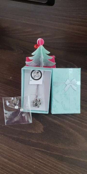 Ожерелье красивое! Прибыл после предполагаемого срока, но я был рад, что он прибыл. Я не 'не знаю, в долгосрочной перспективе, но материал выглядит хорошо. Вы можете 'т видеть фотографию очень хорошо, но это 'с частью. Довольно маленький. Они послали пару тостов с сережкой. Пришла в милой маленькой коробочке.