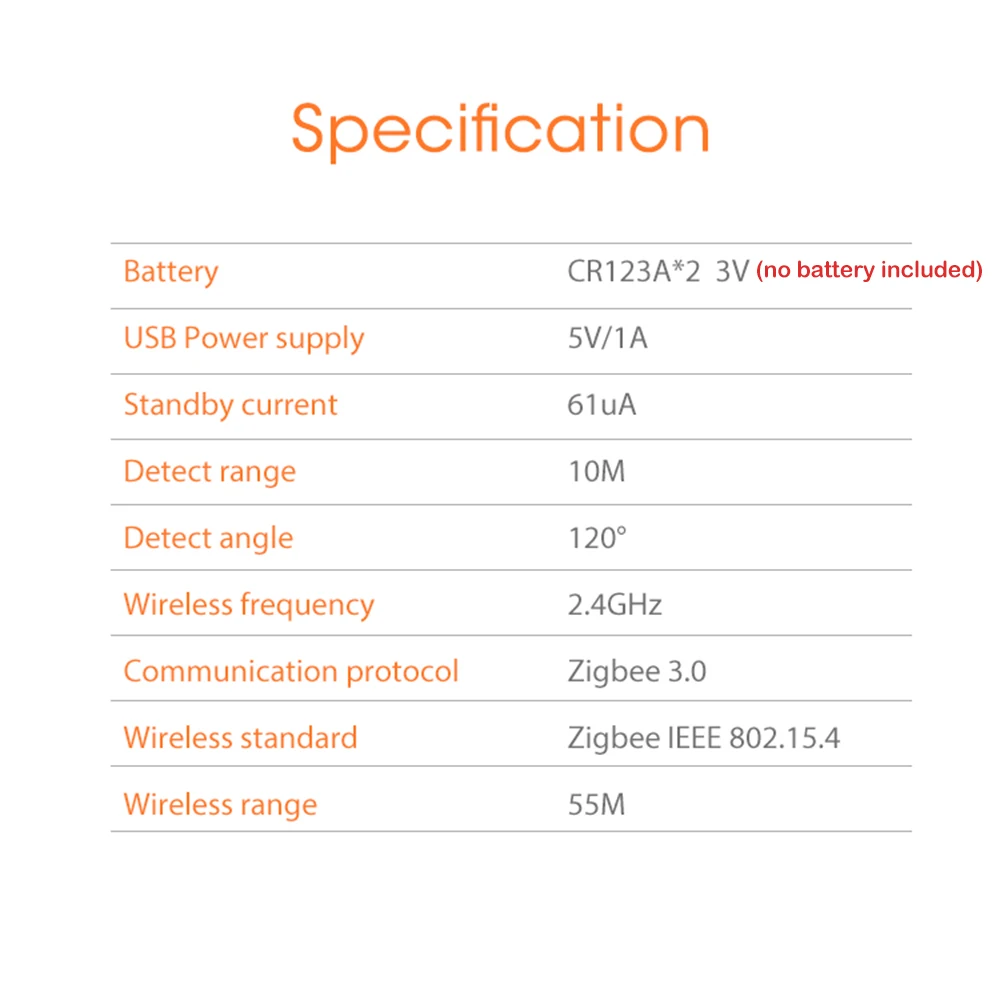 ДвижениеБатарея: CR123A 3V * 2 (без Батарея входит в комплект)Источник питания USB: 5 В/1 АТок в режиме ожидания: 61uAДиапазон обнаружения: 10 мУгол обнаружения: 120 ℃Беспроводной частота: 2,4 ГГцПротокол связи: zigbee 3,0Беспроводная stardard:IEEE 802,11 b/g/nБеспроводной диапазон: 40 мРазмер: 68 мм * 56 мм * 56 мм