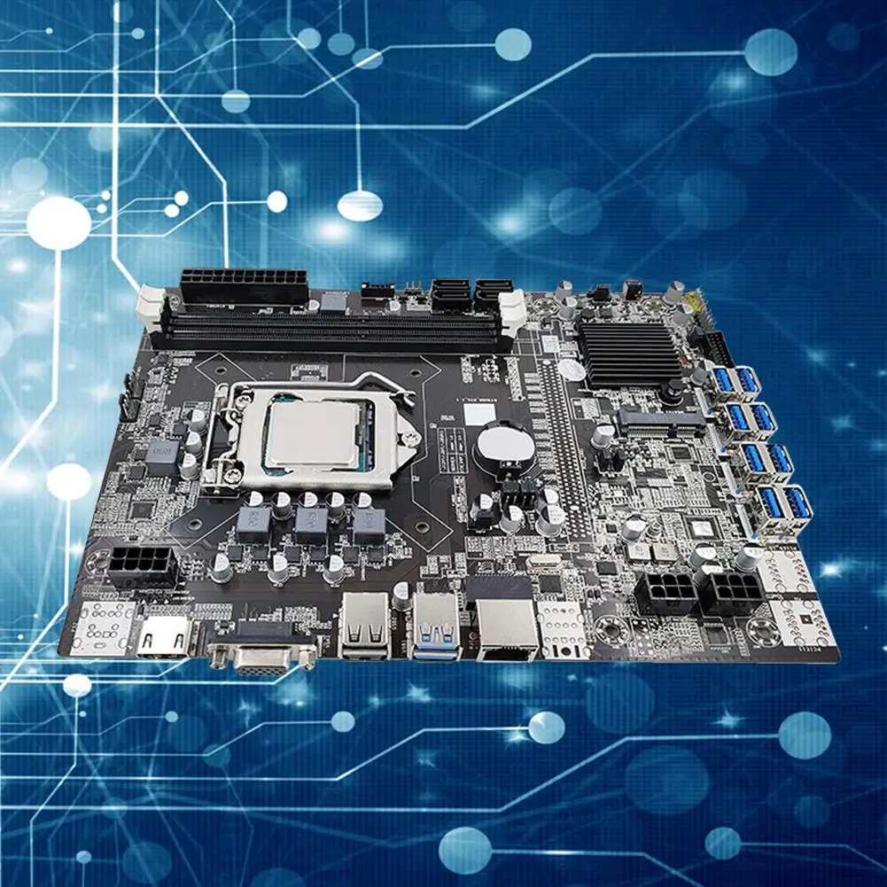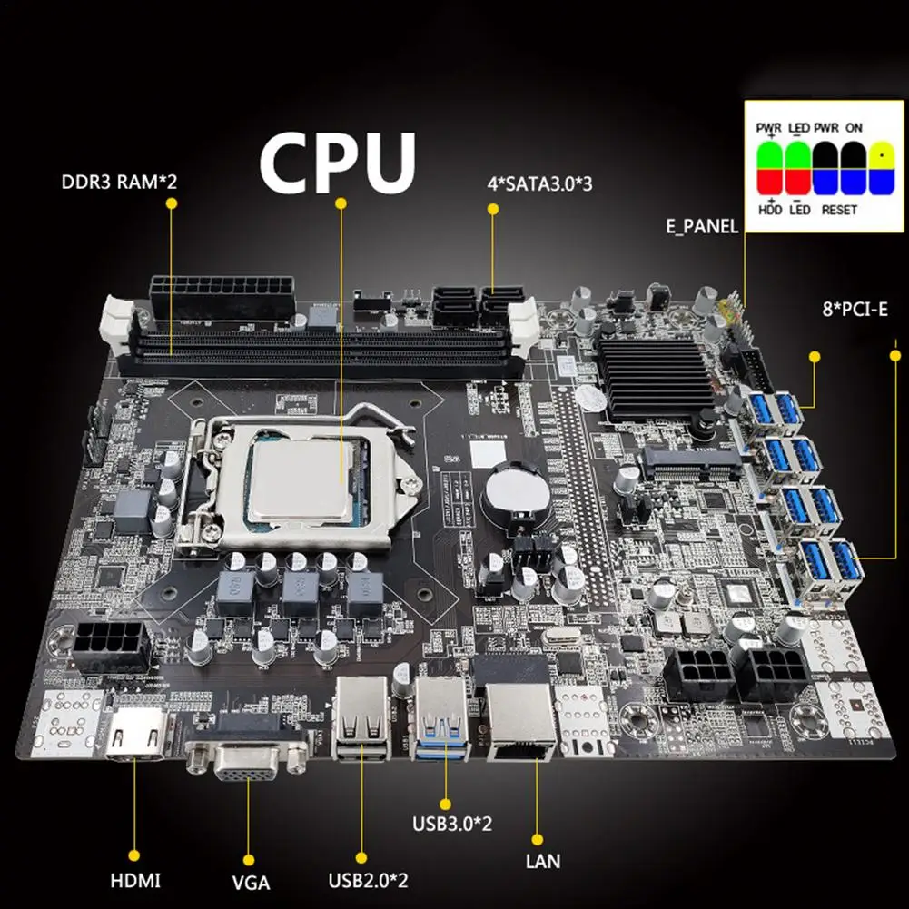 1. Поддержка до 32 Гб: Поддержка 32 Гб, 1 слот PCI-E x 8 и поддержка 32 ГБ для максимального расширения подключения и скорости майнинга.2. Длительный срок службы: материнская плата принимает более безопасное гнездо, LAN и аппаратный уровень защиты от перенапряжения для обеспечения срока службы и надежности компонентов.3. Защита от стабилизации напряжения: конденсатор стабилизации напряжения обеспечивает стабильное напряжение для вашего устройства питания на GPU.4. Состояние обнаружения: обнаружение состояния слота PCI-E указывает на состояние каждого графического процессора на вашей платформе в режиме реального времени.5. Идеально подходит: разработан, чтобы соответствовать оригинальной модели с идеальной заменой и высококачественными компонентами.Описание:Материнская плата для майнинга использует 1 разъем PCI-E x 8, 32 Гб поддержки и 100 м локальной сети для максимального подключения и скорости майнинга. Он оснащен конденсатором стабилизации напряжения и более безопасным ядром гнезда.Характеристики:Модель материнской платы: B75 USB-BTCИнтерфейс процессора: LGA1155Серия GPU: серия LGA1155Размер материнской платы: 230 мм * 175 мм/9,06*6,89 дюймаСетевая карта: 100 м Сетевая картаОбъем поддержки: 16 г * 2Слот для видеокарты: PCI-E X8 * 1Слот для дисплея: стандарт PICE-3.0Интерфейс USB: USB2.0 * 2/USB3.0 * 2Посылка:1 х материнская плата для майнинга