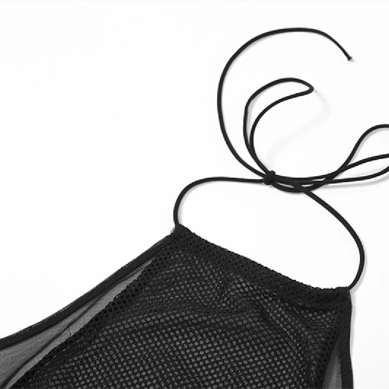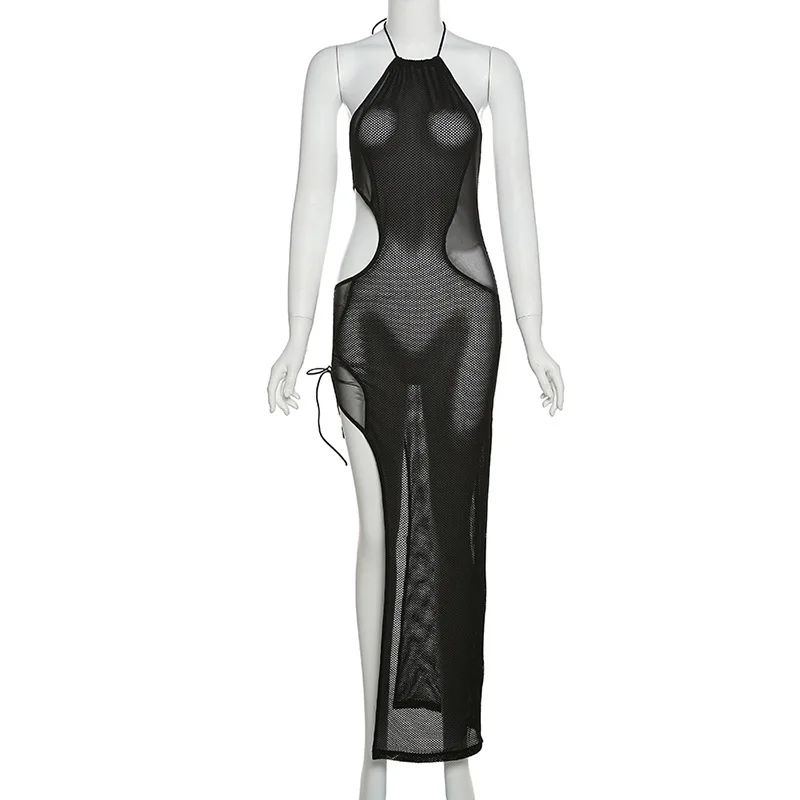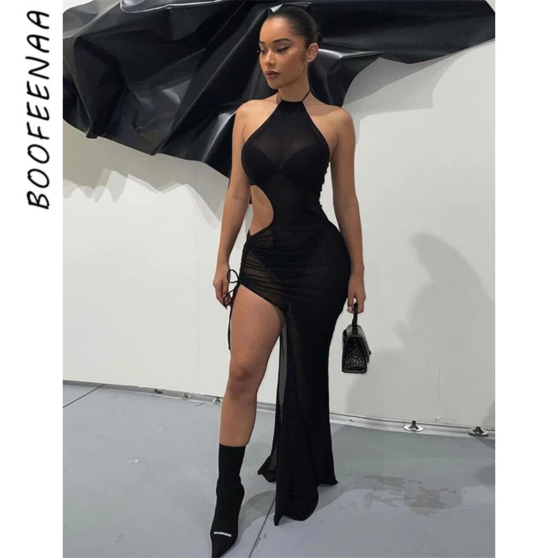 Прозрачные сетчатые черные платья BOOFEENAA, женское уличное модное платье, сексуальное женское Асимметричное Платье макси с открытой спиной и лямкой на шее, женское платье