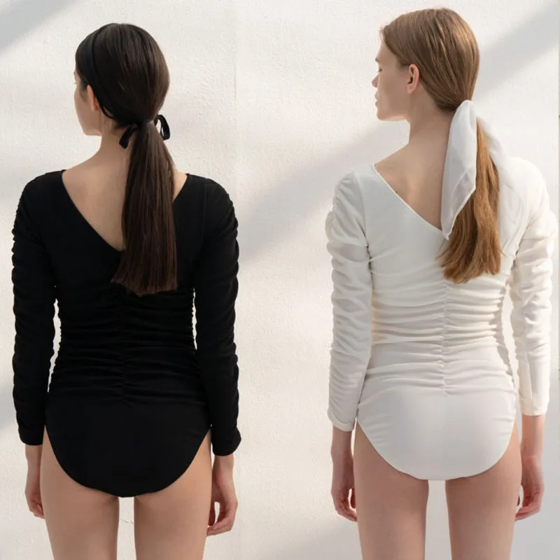 Цельный купальник с длинным рукавом, Женская однотонная одежда для плавания, купальный костюм, монокини для контроля живота, купальный костюм в Корейском стиле, пляжная одежда с подкладкой