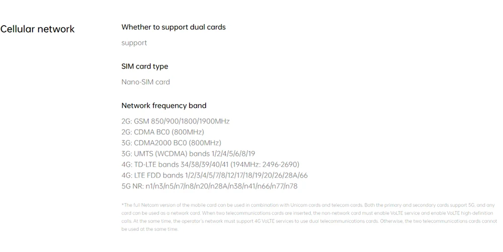 2G: GSM 850/900/1800/1900 МГц2G: CDMA BC0(800 МГц)3G: CDMA2000 BC0(800 МГц)3G: UMTS(WCDMA) полосы 1/2/4/5/6/8/194G: TD-LTE полосы 34/38/39/40/41(194 МГц: 2496-2690)4G: LTE FDD полосы 1/2/3/4/5/7/8/12/17/18/19/20/26/28A/665G NR: n1/n3/n5/n7/n8/n20/n28A/n38/n41/n66/n77/n78