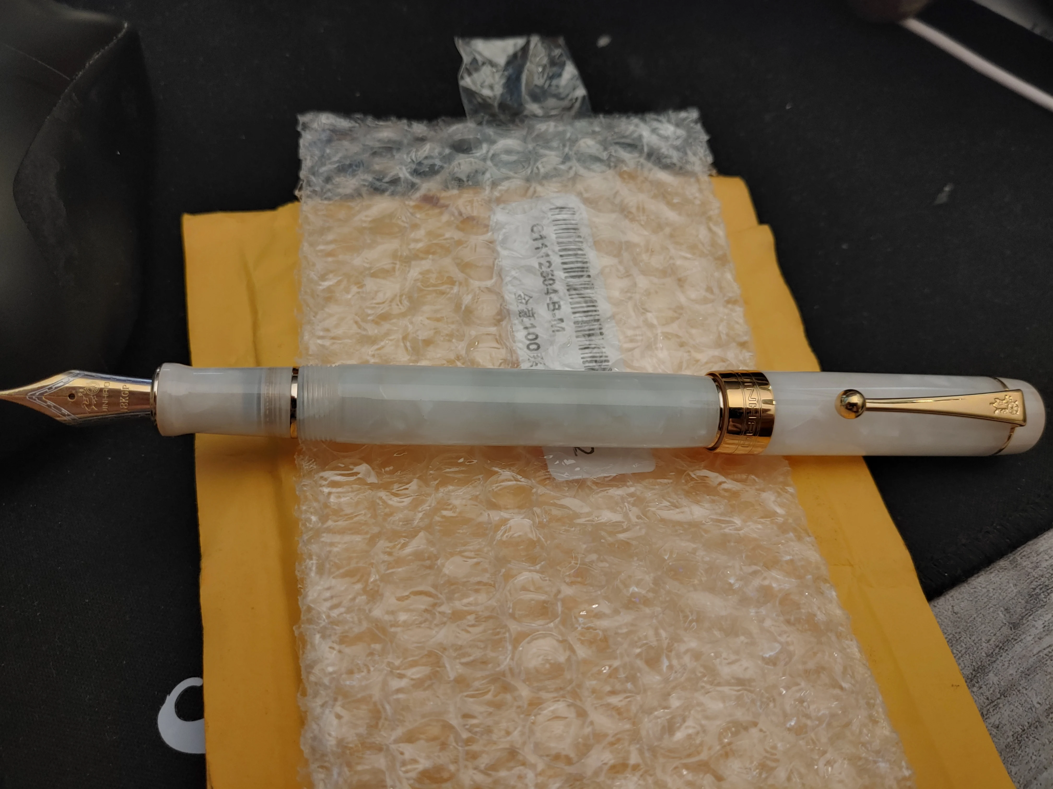 Моя ручка прибыла сегодня (примерно через 30 дней после заказа), и я был очень приятно удивлен текстовым сообщением, которое я получил от транспортной компании, сообщим мне, что это было за пределами моей двери! Ручка Абсолютно великолепная, и прибыла в один кусок благодаря отличной работе по упаковке. Он был внутри маленького пузырчатого мешка внутри пузырчатого конверта! Крышка выключается в течение трех поворотов и, кажется, очень надежно размещается. Я не могу дождаться, чтобы чернила и положить наконечник на бумагу. Я только должен найти подходящие чернила для него, теперь...