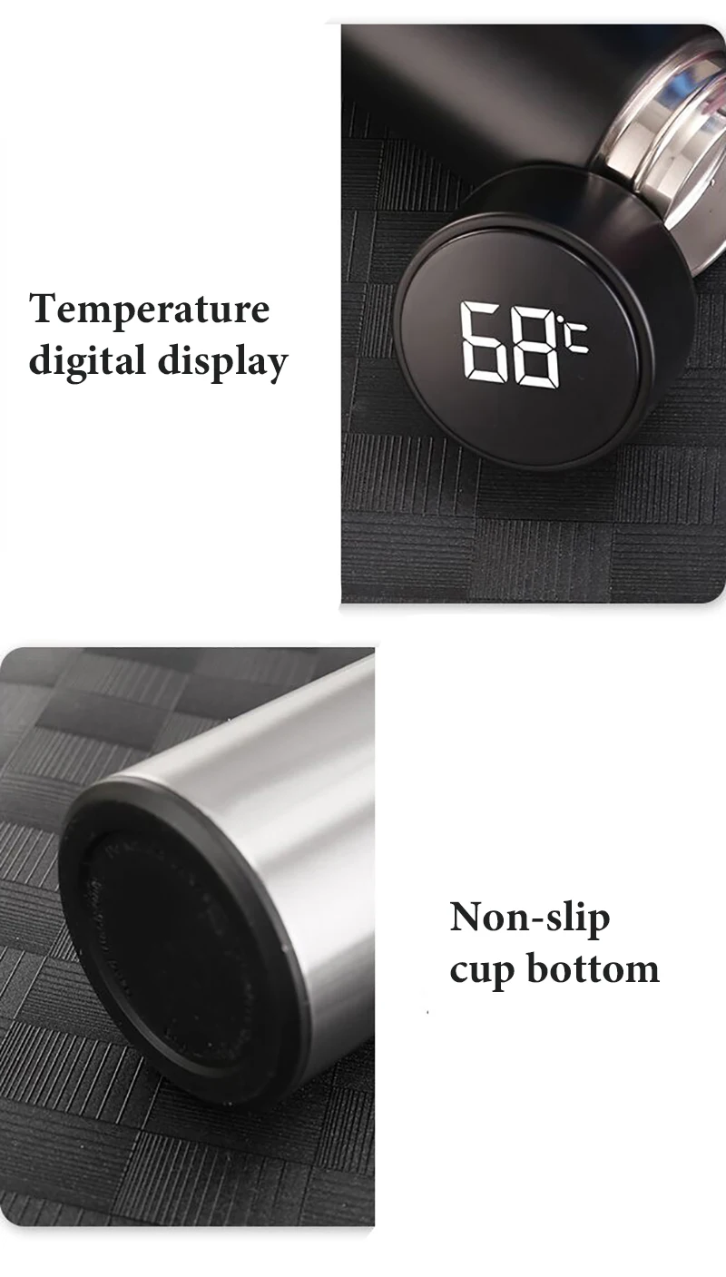 Ёмкость: 500 мл время сохранения тепла: 24-часовой формат часов> 35 ° время сохранения холода: 24 ч <15 ° Материал: в вакууме нержавеющая сталь Размеры: 6,5*6,5*22 см Вес: 0,65 кг 1. Портативный и прочный. Идеально подходит для путешествий, активного отдыха, автомобиля, офиса, дома, школы, пикника, пеших прогулок, кемпинга и т. д. 2. С сенсорным ЖК-экраном HD для быстрого отображения температуры воды в реальном времени. Позвольте вам пить воду, которая наиболее подходит для температуры в любое время и в любом месте. 3. Изготовлен из нержавеющей стали 304, двухслойный вакуумный дизайн, безопасный, без BPA и экологически чистый, без запаха и легко моется. Он может держать горячую или холодную воду в течение 12-24 часов. 4. Эта Вакуумная бутылка для воды также является хорошим контейнером для кофе, соковыжималки, молока, пива, напитков и ежедневного увлажнения. Лучший подарок для семьи и друзей.