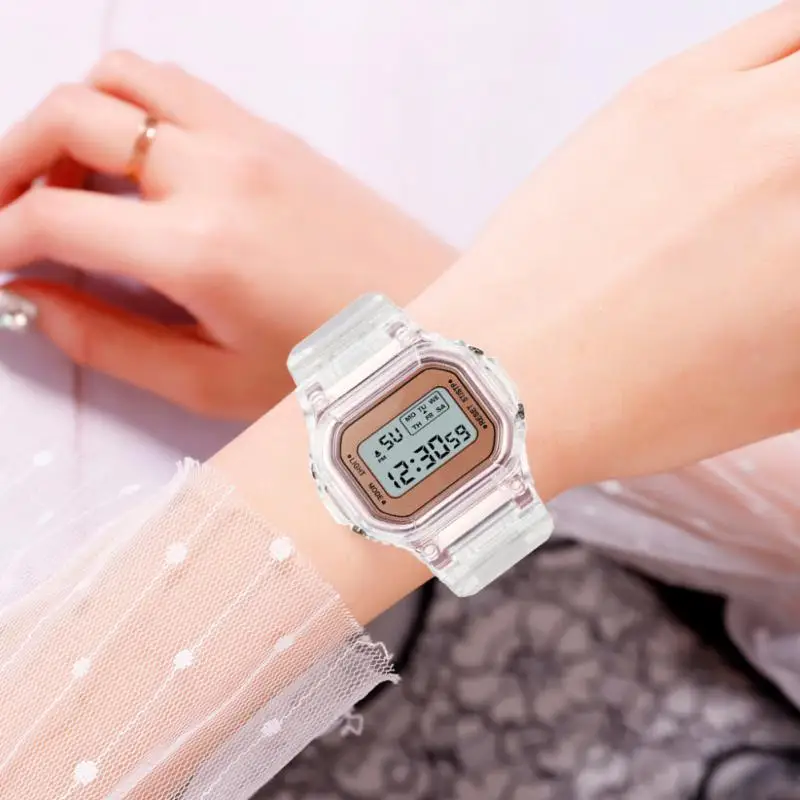 2021 светящиеся спортивные часы онлайн знаменитостей с небольшим квадратным прозрачным ремешком IPX67 женские и студенческие электронные часы.