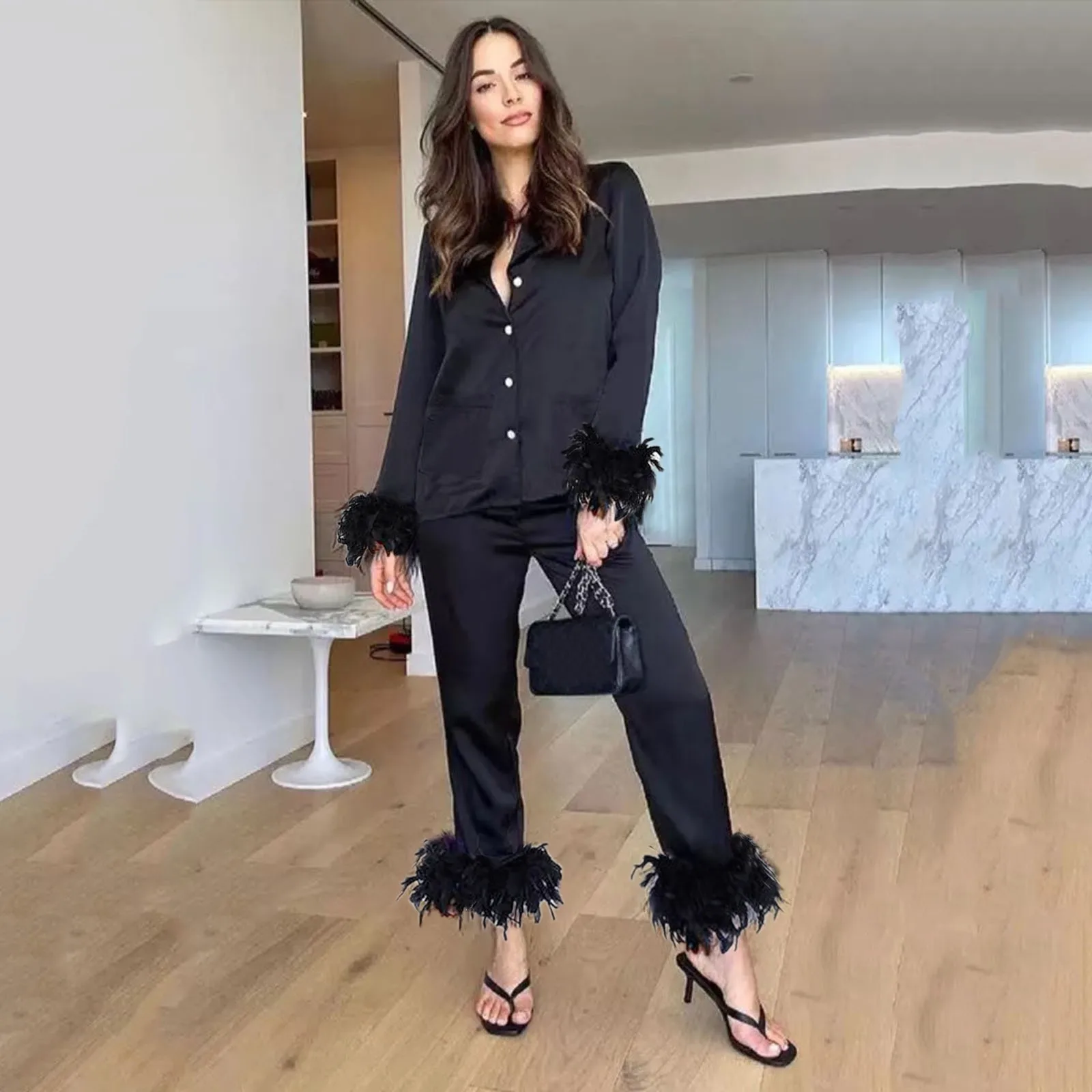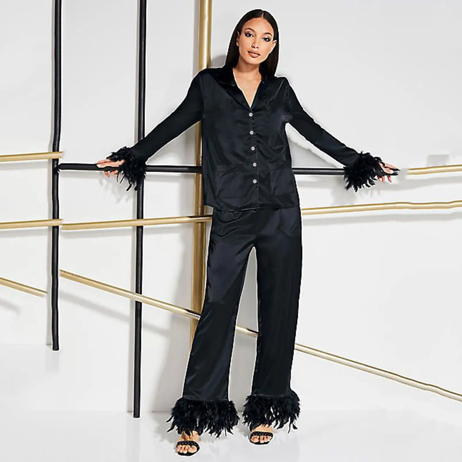 Пижама женская из двух предметов, шикарный топ с длинным рукавом и длинными брюками с перьями, комплект одежды для сна из 2 предметов, домашняя одежда, пижама, одежда для сна